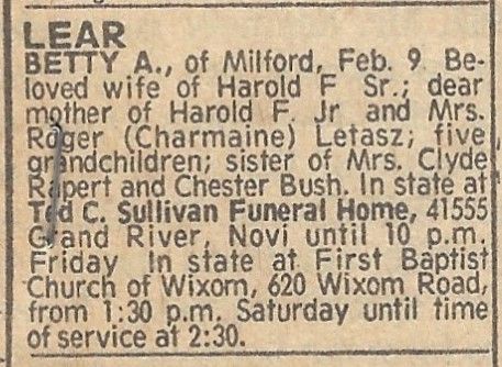 | Lear, Betty A. | 6 Jun 1923 | 8 Feb 1978 | 54y 8m 2d | F | 60 | 1 | Elizabeth A. Bush | |||||