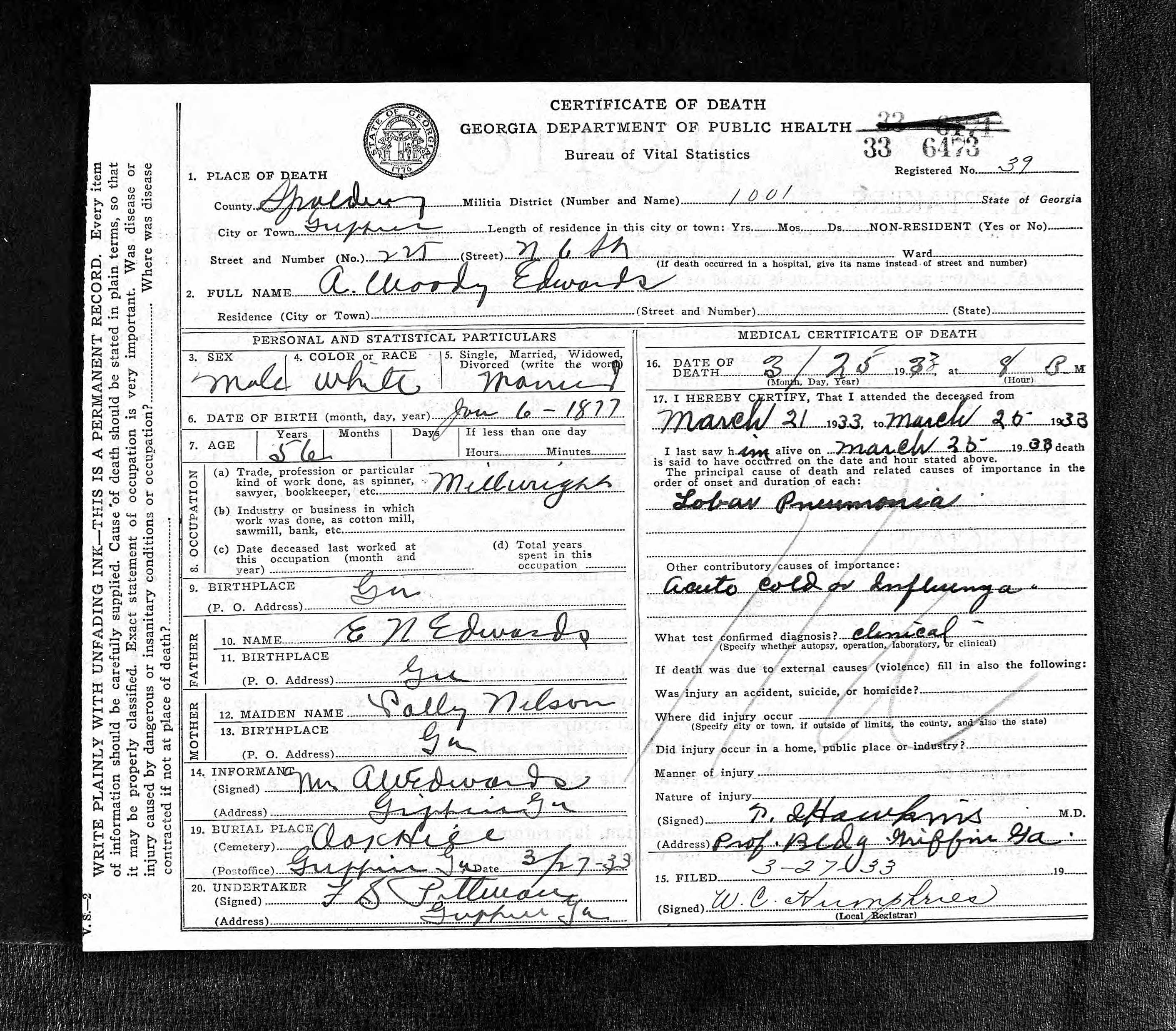 born: 29 Jul 1884 - Cumberland, Kentucky died: 27 Jul 1970 - Bonham, Fannin, Texas Buried: Willow Wild Cemetery, W 7th St, Bonham, Fannin, Texas, USA (L-495-7NW) | ||||||||||