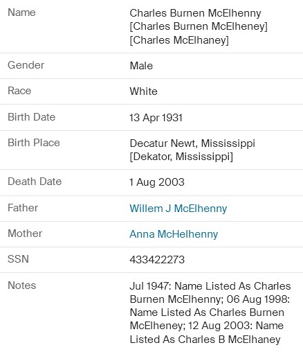 Residences1931 - Decatur, Newton, Mississippi | 1940 - Newton, Mississippi 1950 - Washington, Mississippi 2003 - , Oakland, Yalobusha, Mississippi, USA |