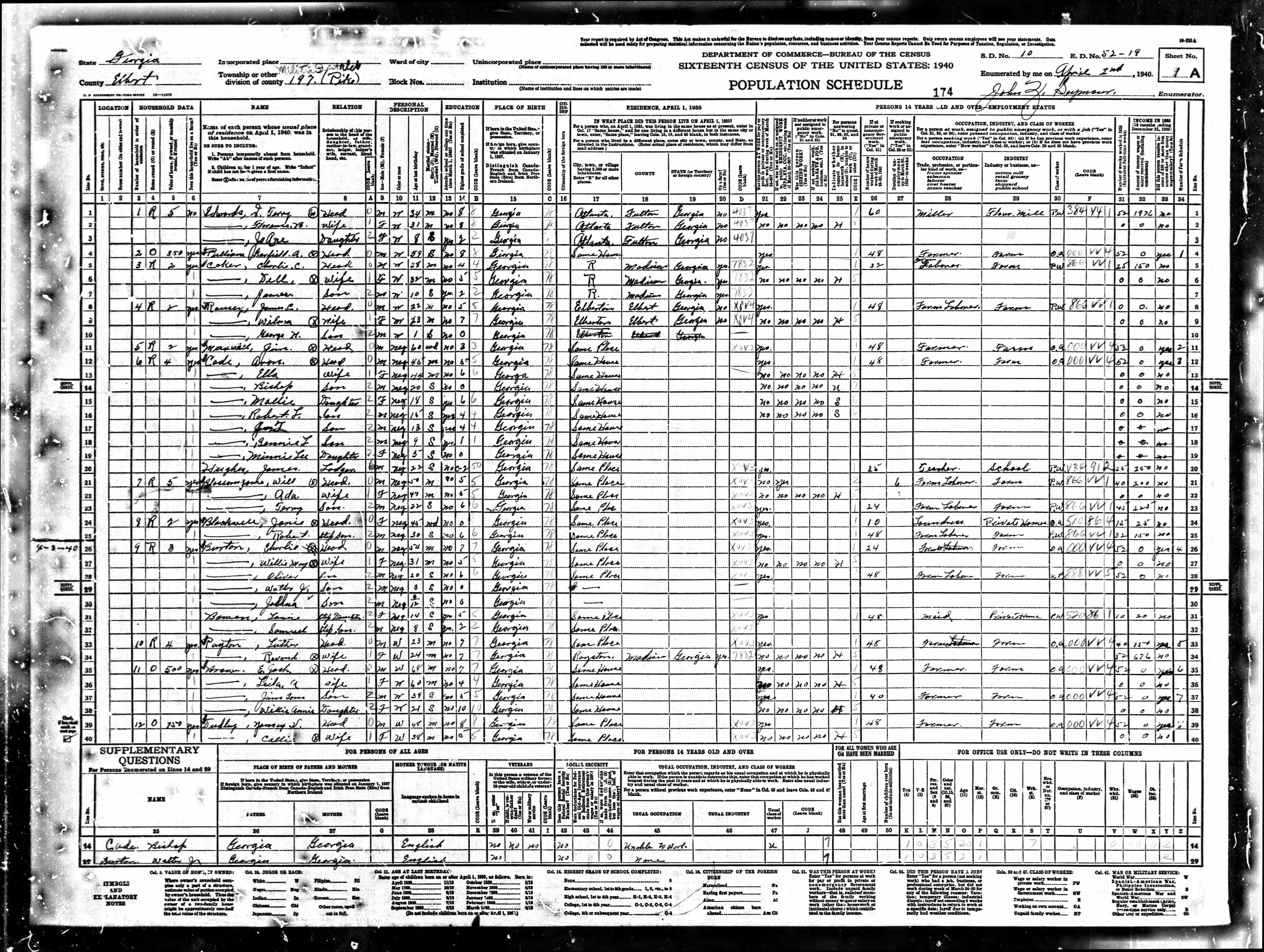Residences1905 - Atlanta, Fulton, Georgia | 1910 - Cabin, Spalding, Georgia 1920 - Cabin, Spalding, Georgia 1930 - Atlanta, Fulton, Georgia 1940 - Pike, Elbert, Georgia 1950 - Owosso, Shiawassee, Michigan 1974 - , Barnesville, Lamar, Georgia, USA |