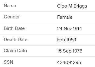 Residences1914 - Louisiana | 1920 - Union, Louisiana 1940 - Bernice, Union, Louisiana 1950 - Bowie, Texas 1989 - , Texarkana, Bowie, Texas, USA |
