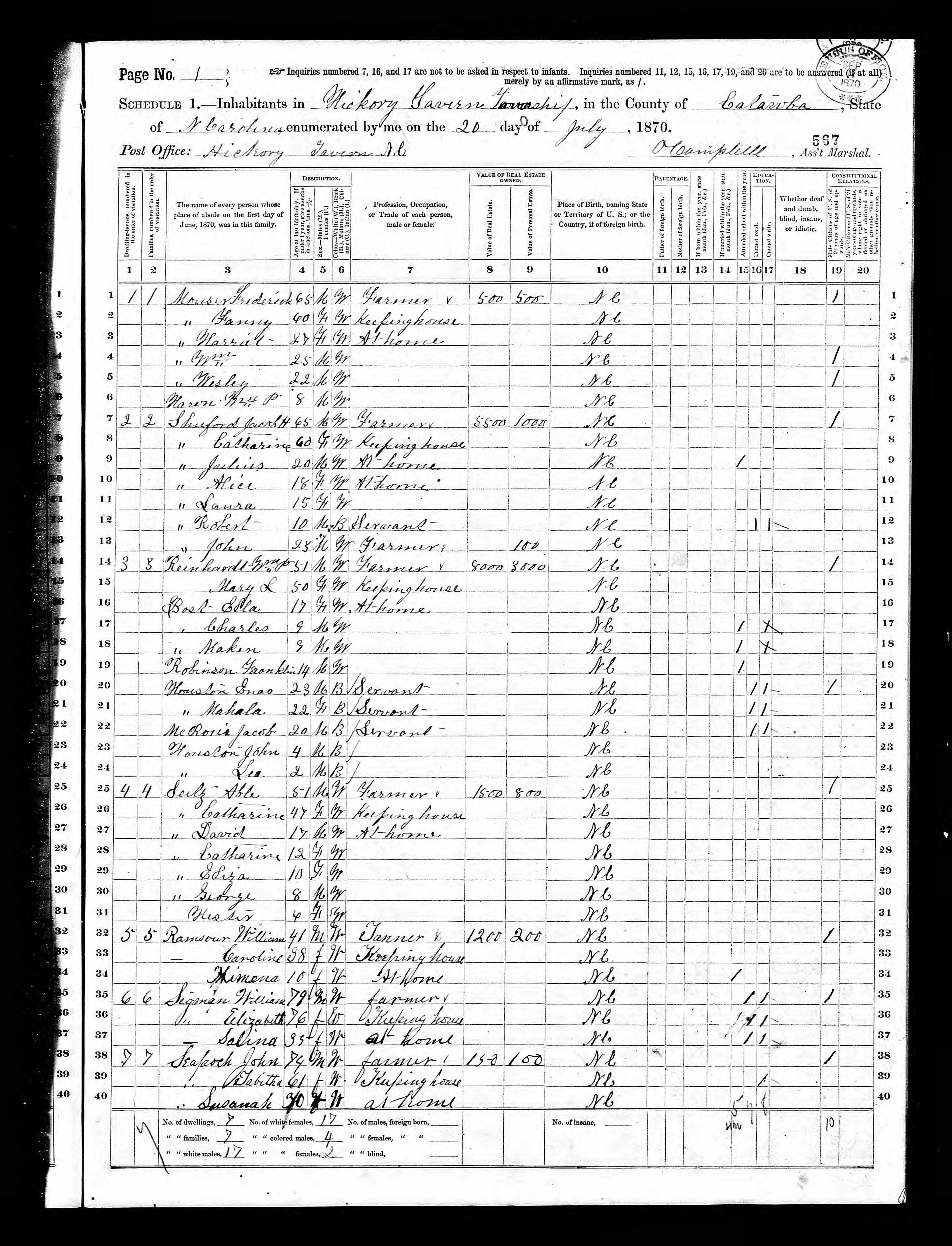 Residences1802 - North Carolina | 1850 - Catawba, North Carolina 1860 - Catawba, North Carolina 1870 - Hickory Tavern, Catawba, North Carolina |