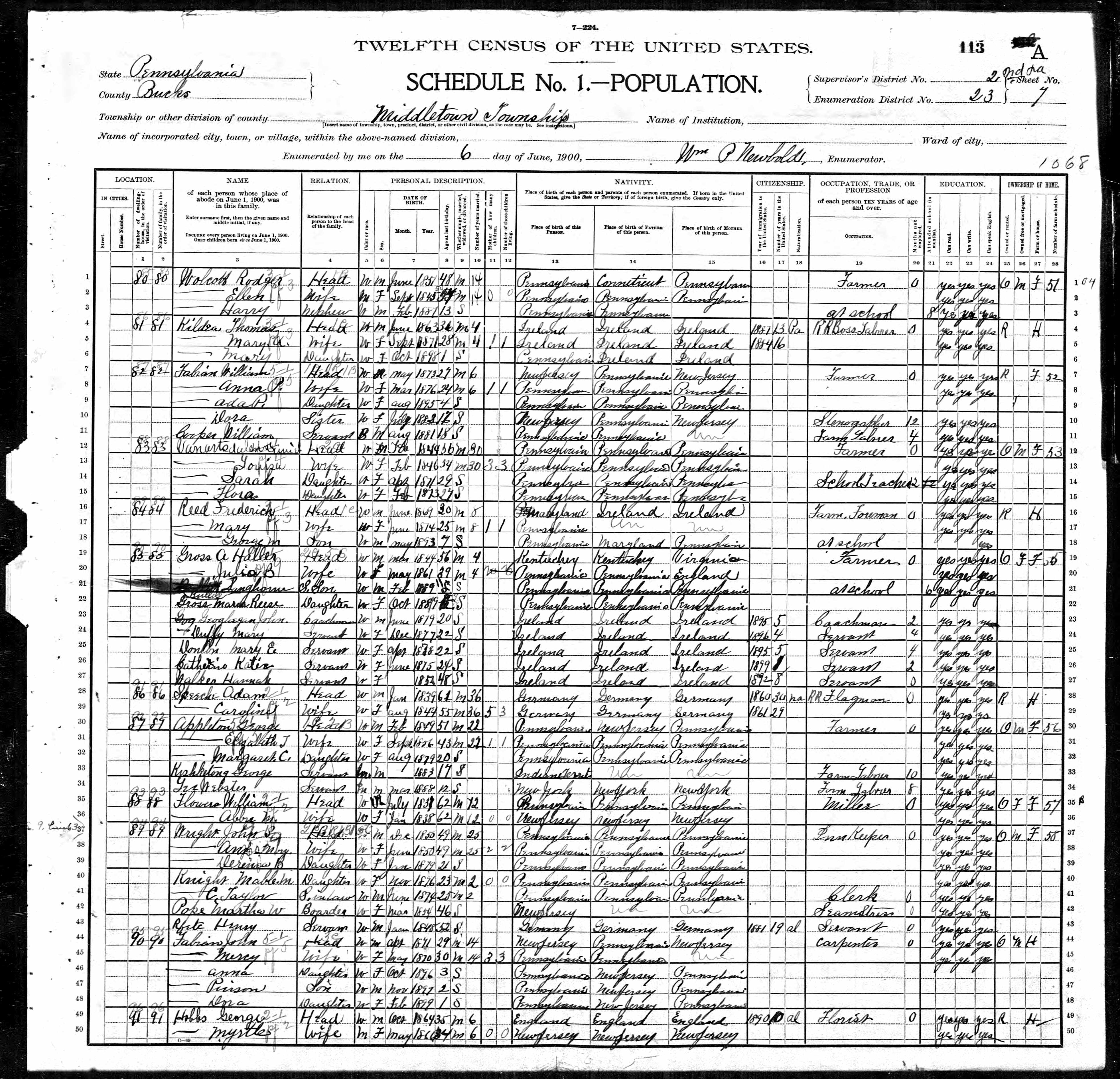 Residences1887 - Bristol, Pennsylvania | 1900 - Middletown, Bucks, Pennsylvania 1910 - Reading, Berks, Pennsylvania 1920 - Newtown, Bucks, Pennsylvania 1930 - Yardley, Bucks, Pennsylvania 1940 - Yardley, Bucks, Pennsylvania 1944 - Yardley, Pennsylvania |