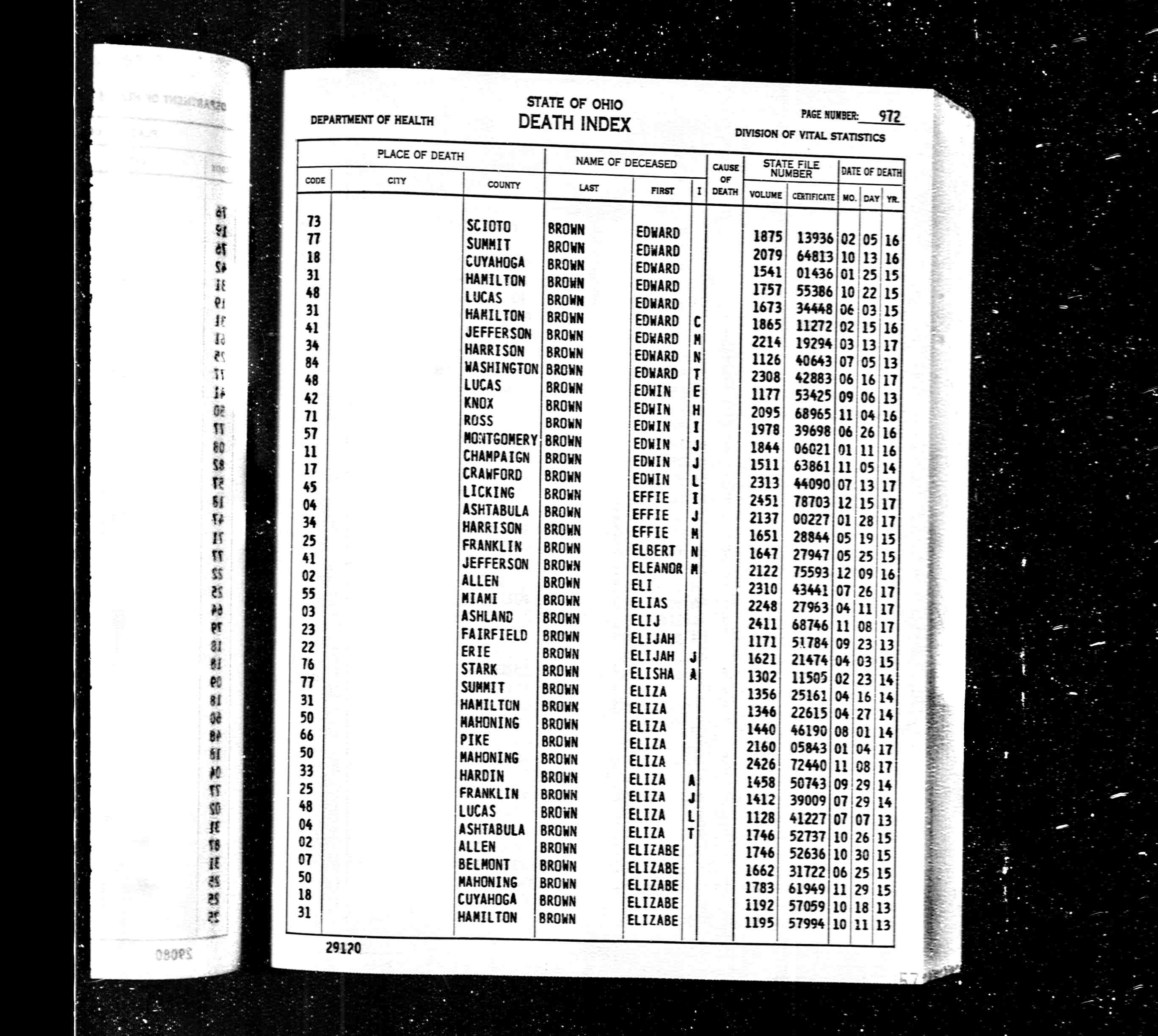 The Browns of Ohio Information on the Brown Family Tree was gathered from Census Records, War & Pension Records, Ship Logs, Marriage Certificates, Birth and Death Records, Cemetery Records, LDS Records, Wills and family members. Corrections & additional information are appreciated.