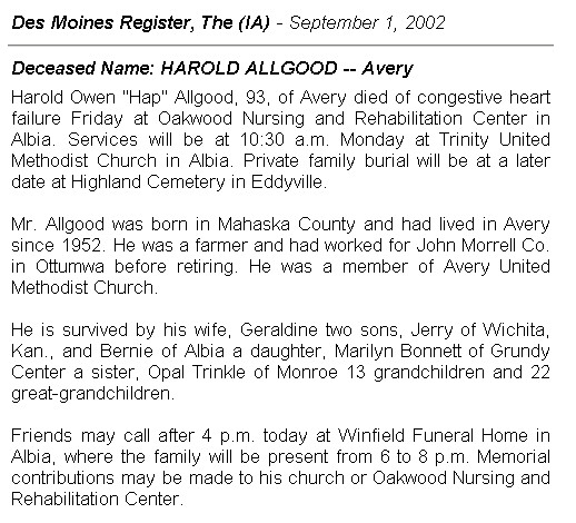 born: 15 Feb 1920 - Filley, Gage, Nebraska died: 1 Dec 1999 Buried: Pleasant Grove Baptist Church Cemetery, Lake Wheeler Rd, Fuquay-Varina, Wake, North Carolina, USA, 27526 | ||||||||||