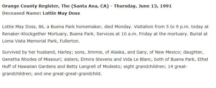 born: 12 Jun 1903 - Arkansas died: 11 Apr 1995 - Riverside, California buried: Loma Vista Memorial Park, 701 E. Bastanchury Road, Fullerton, Orange, California, USA, 92835 | ||||||||||
