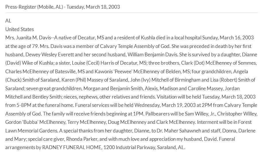 | m. Calvin Daniel Hegwood - Married: 8 Jul 1962 - Union, Newton, Mississippi | ||||||||||