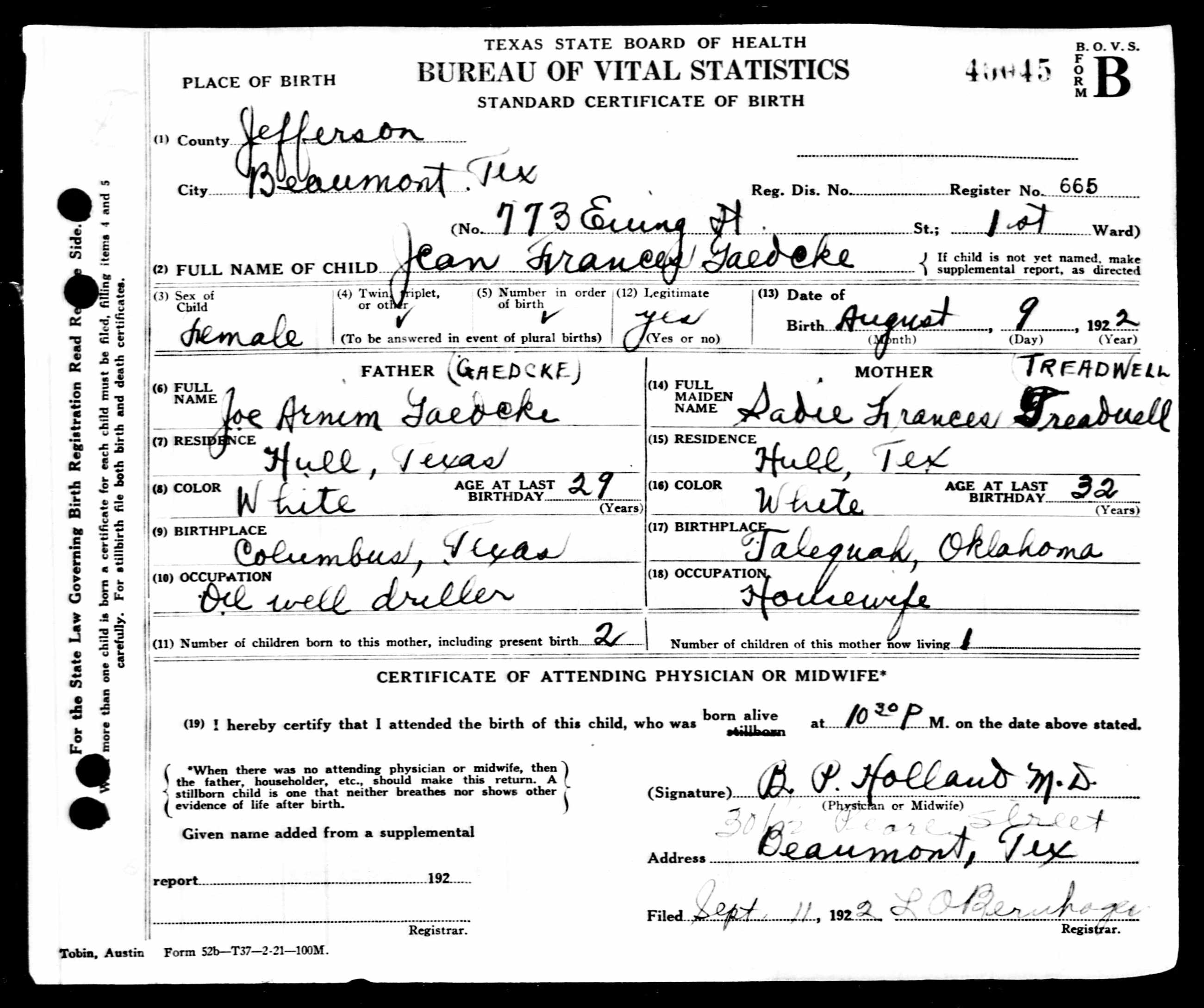| Daughter of Edwin Gehefer & Evelyn Jump | ||