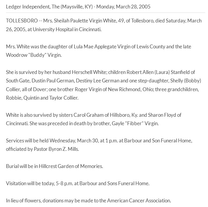 born: 14 Jun 1942 died: 7 Nov 2021 - Cincinnati, Hamilton, Ohio buried: Maple Grove Cemetery, Maple Grove Cemetery Road, Cleves, Hamilton, Ohio, USA, 45002 (8--) | ||