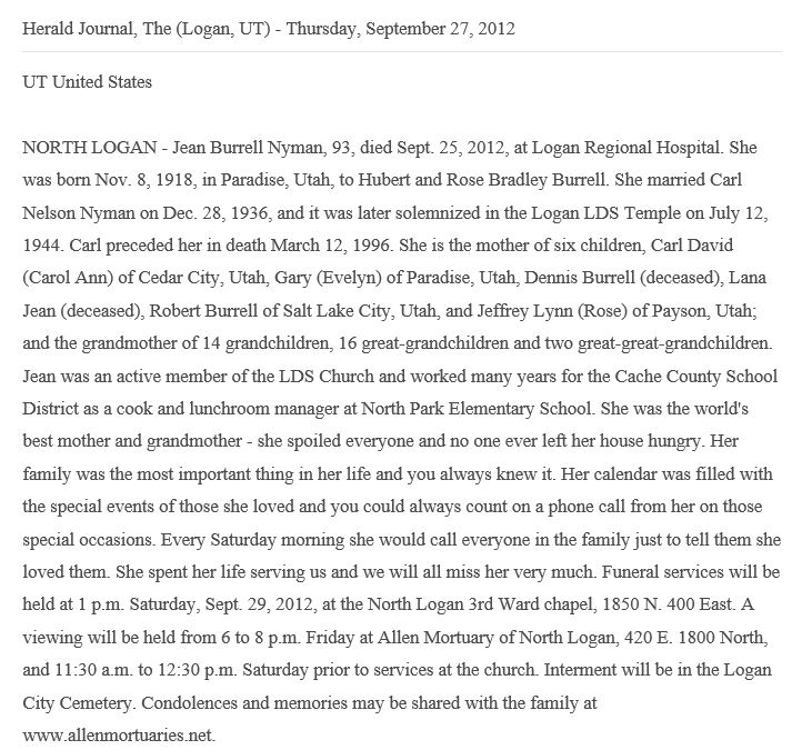 born: 12 Sep 1916 - Bear River City, Box Elder, Utah died: 8 Dec 2005 - Bountiful, Davis, Utah buried: Brigham City Cemetery, 300 East 300 South, Brigham, Box Elder, Utah, USA, 84302 (B 50-2-4) | ||||||||||
