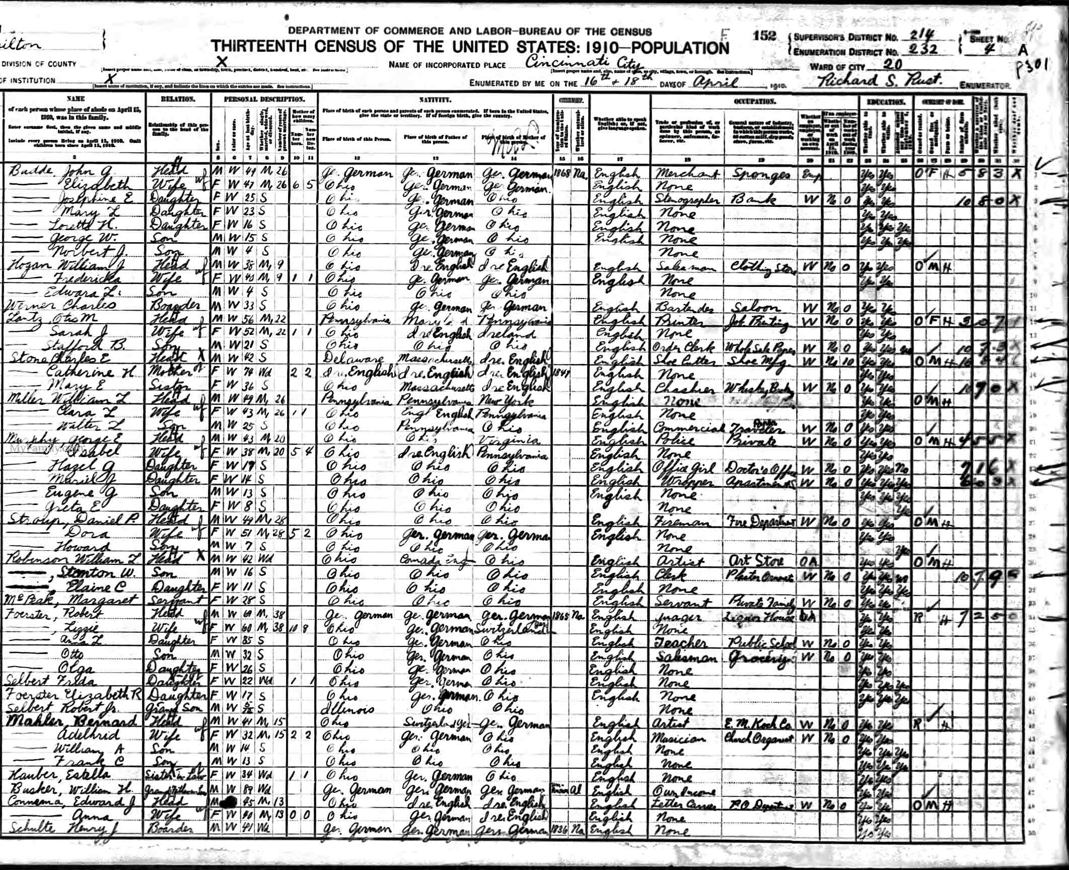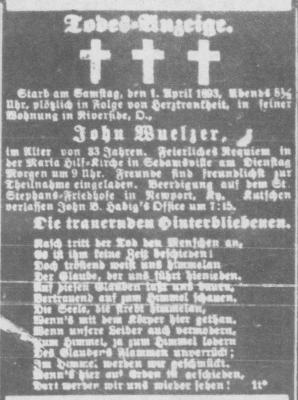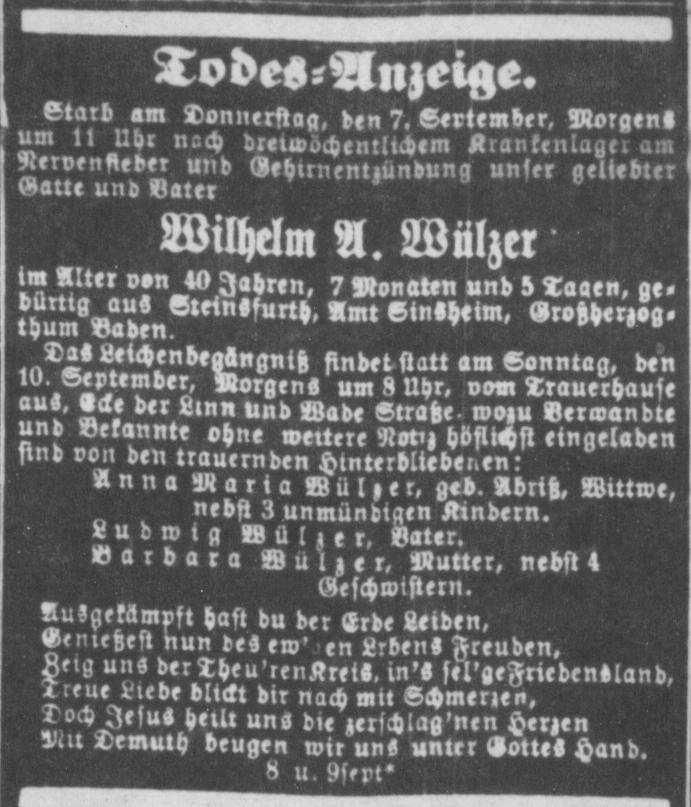 The Wuelzer family arrived in the United States on 31 Jan 1855 from Steinsfurt, Sinsheim, Baden, Germany (Southeast of Heidelberg). They sailed from Rotterdam to New York aboard the Arnold Boninger. On board were Ludwig (51) & Barbara (38) Wülzer and four of their six children - Adam (16), Heinrich (11), Catherina (9), and Frederika (7). The two oldest boys, Wilhelm (23) & Jacob (21) were already in the United States. The family settled in Cincinnati, Ohio. The family name was changed to from Wülzer to Wuelzer in the 1860s. Both spellings appear on many legal documents until about 1900. Misspellings are frequent. Ludwig & Barbara attended the Catholic Church in Steinsfurt Parish, Waibstadt, Reihen, Baden-Württemberg where the birth of Wilhelm, Jacob & Adam are recorded. Information on the Wuelzer Family Tree was gathered from Census Records, War & Pension Records, Ship Logs, Marriage Certificates, Birth and Death Records, Cemetery Records, LDS Records, Wills and family members. Additional information is appreciated.