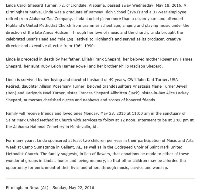 | 30 Aug 1943 | 18 May 2016 | 72y 8m 19d | 1 | 1381 | Linda Carol Shepard | |||||||