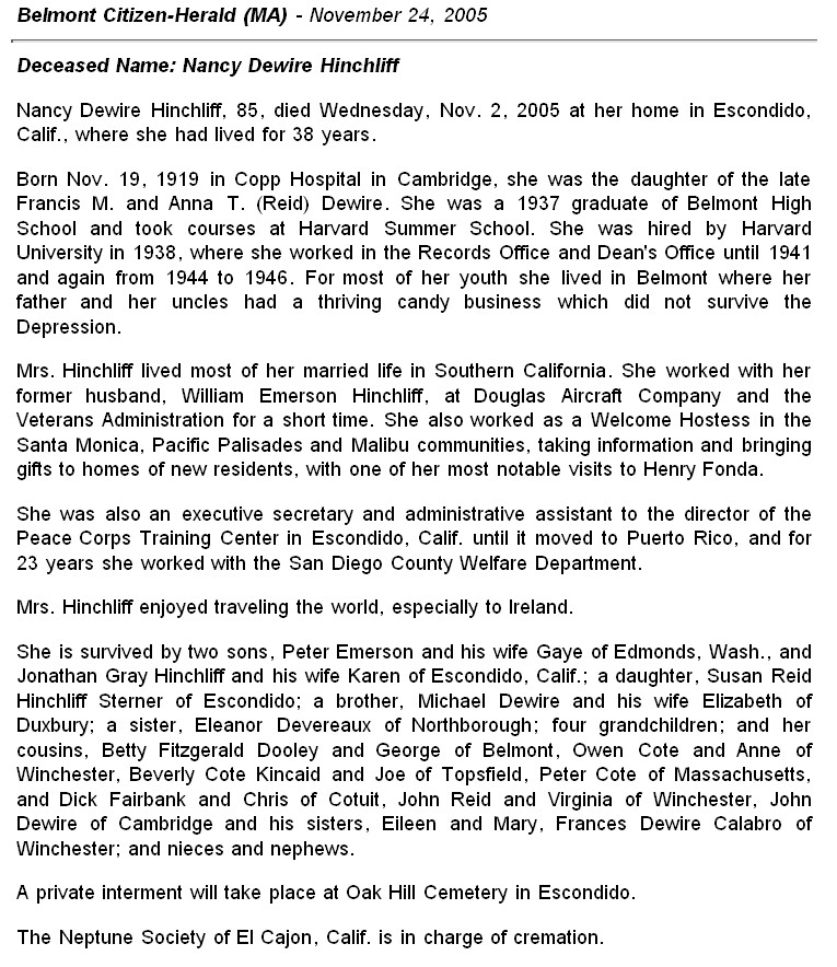 | Hinchliff, Nancy Dewire | 19 Nov 1919 | 2 Nov 2005 | 85y 11m 13d | Nancy Elizabeth Dewire | ||||||||