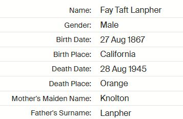 | Lanpher, Fay T. | 27 Aug 1867 | 28 Aug 1945 | 78y 0m 1d | Fay Taft Lanpher | ||||||||