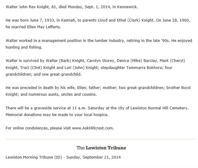 | Knight, Walter John | 7 Jun 1933 | 1 Sep 2014 | 81y 2m 24d | Walter John Rex Knight | Rex | |||||||