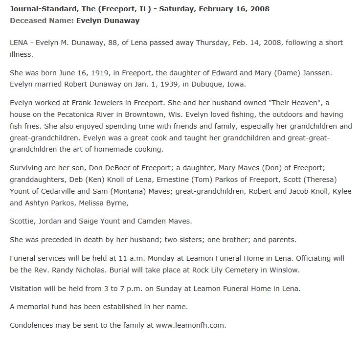| Dunaway, Evelyn M. | 16 Jun 1919 | 14 Feb 2008 | 88y 7m 27d | Evelyn M. Janssen | ||||||||