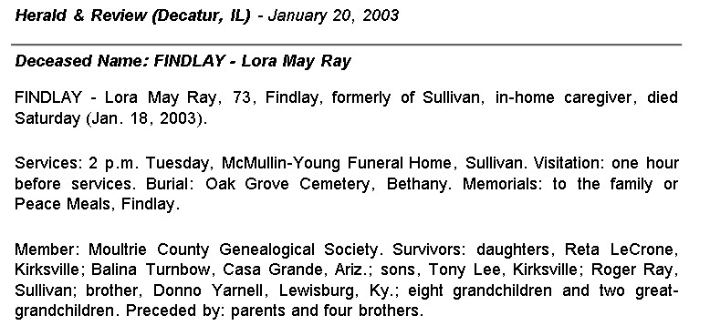 | 17 Jul 1929 | 18 Jan 2003 | 73y 6m 1d | Lora May Yarnell | |||||||||