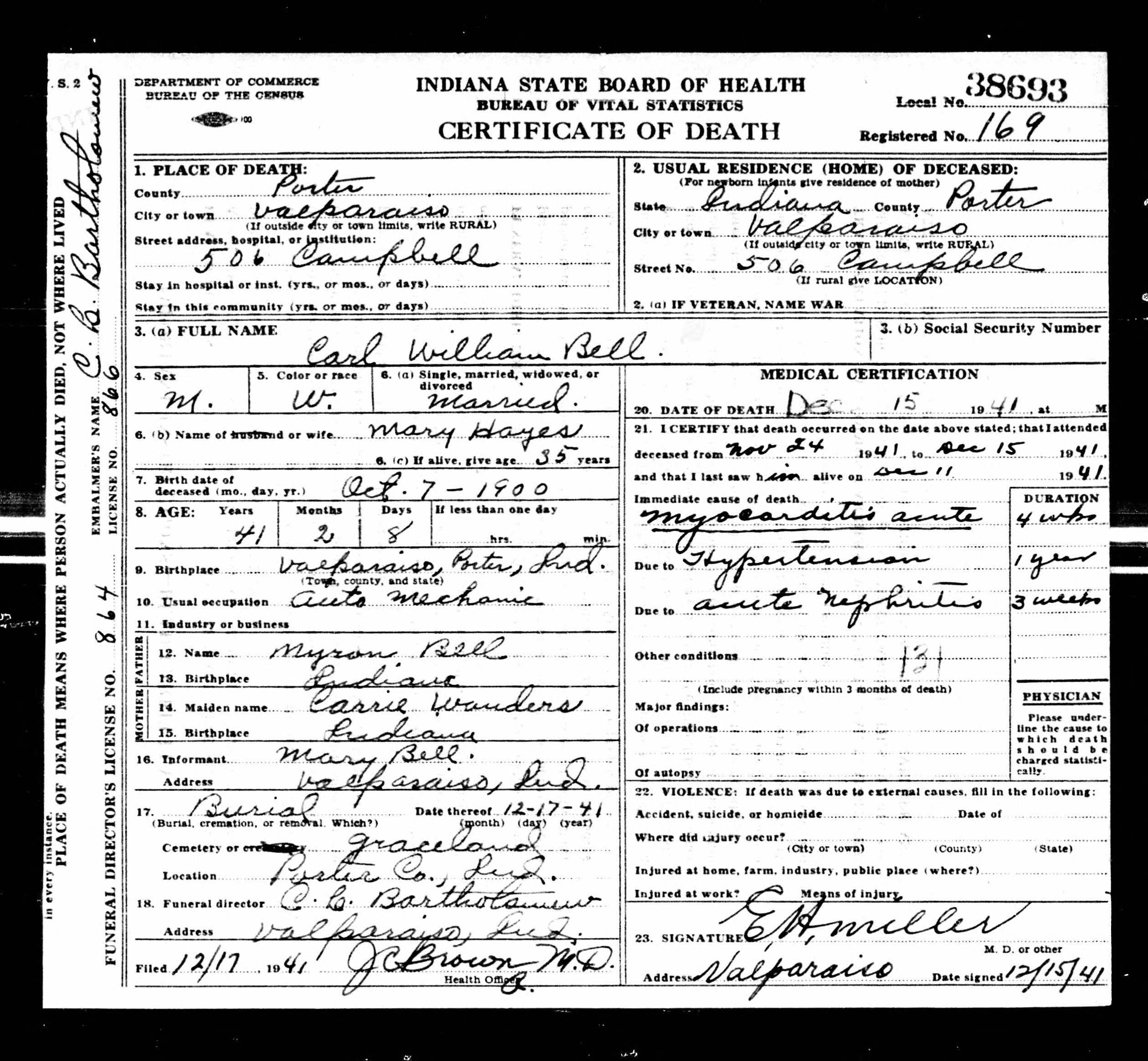 | Bell, Carl W. | 7 Oct 1900 | 15 Dec 1941 | 41y 2m 8d | Morning Side | M02 | 201 | Carl William Bell | |||||