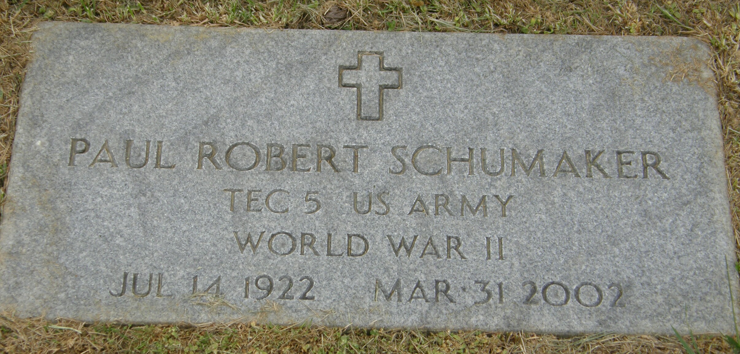 | Schumaker, Paul Robert | 14 Jul 1922 | 31 Mar 2002 | 79y 8m 17d | 01 | 87 | 01 | Paul Robert Schumaker | TEC 5 US Army, World War II | ||||