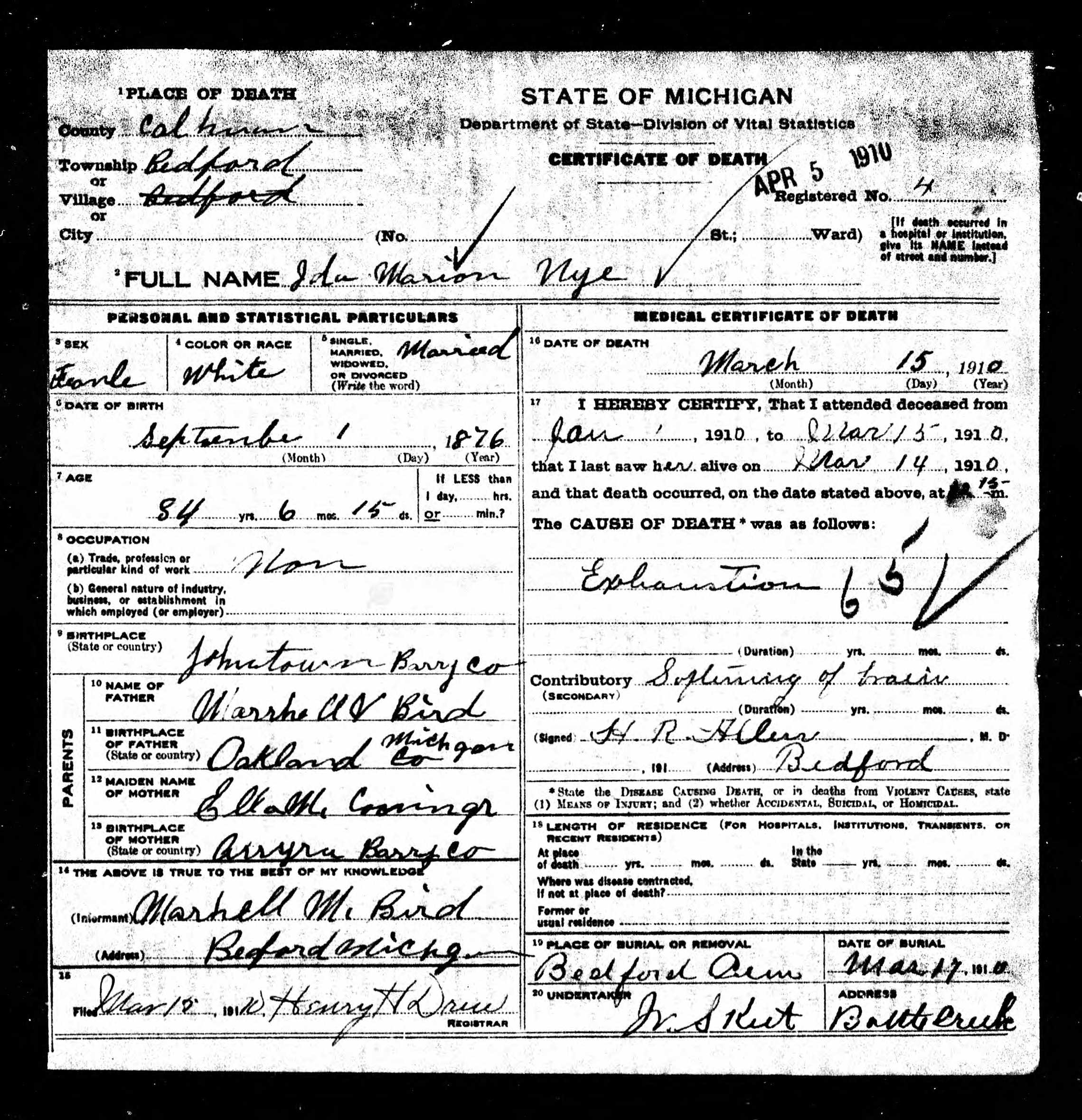 | 1 Sep 1876 | 15 Mar 1910 | 33y 6m 14d | Ida Marion Bird | |||||||||