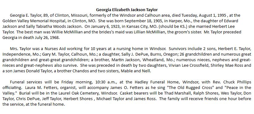| Taylor, Georgia E. | 18 Sep 1905 | 1 Aug 1995 | 89y 10m 14d | Georgia Elizabeth Jackson | ||||||||
