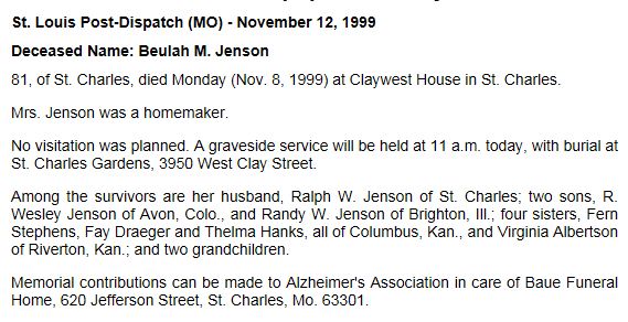 | Jenson, Beulah M. | 2 Feb 1918 | 8 Nov 1999 | 81y 9m 6d | Beulah May Hanks | ||||||||