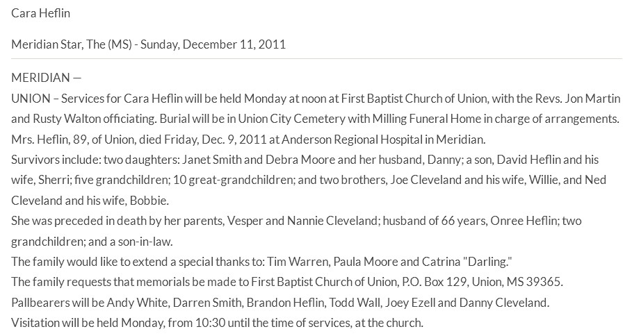 | Heflin, Cara S. Cleveland | 1 Jan 1922 | 9 Dec 2011 | 89y 11m 8d | Cara S. Cleveland | ||||||||