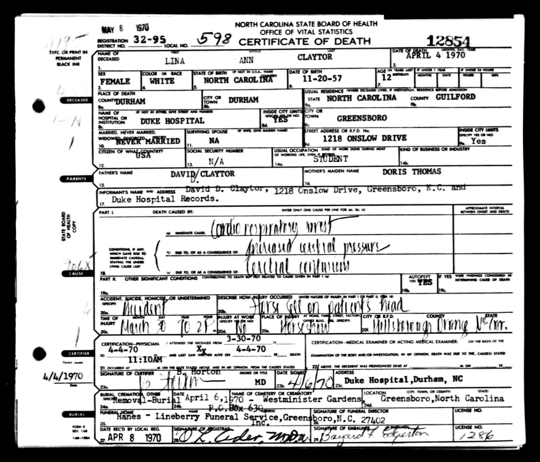 | 20 Nov 1957 | 4 Apr 1970 | 12y 4m 14d | Lina Ann Claytor | |||||||||