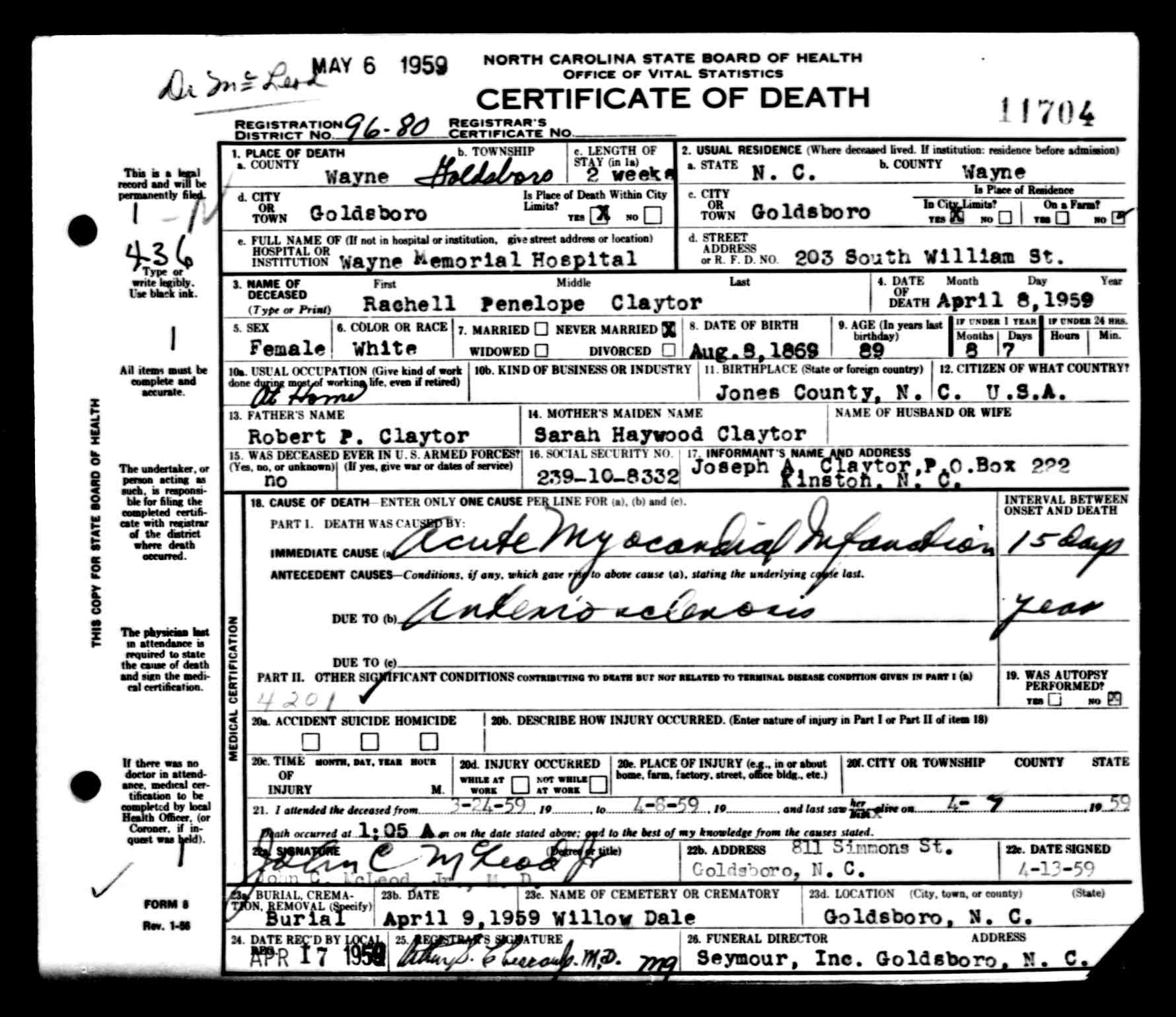 | 1 Aug 1871 | 8 Apr 1959 | 87y 8m 7d | Rachel Penelope Claytor | |||||||||