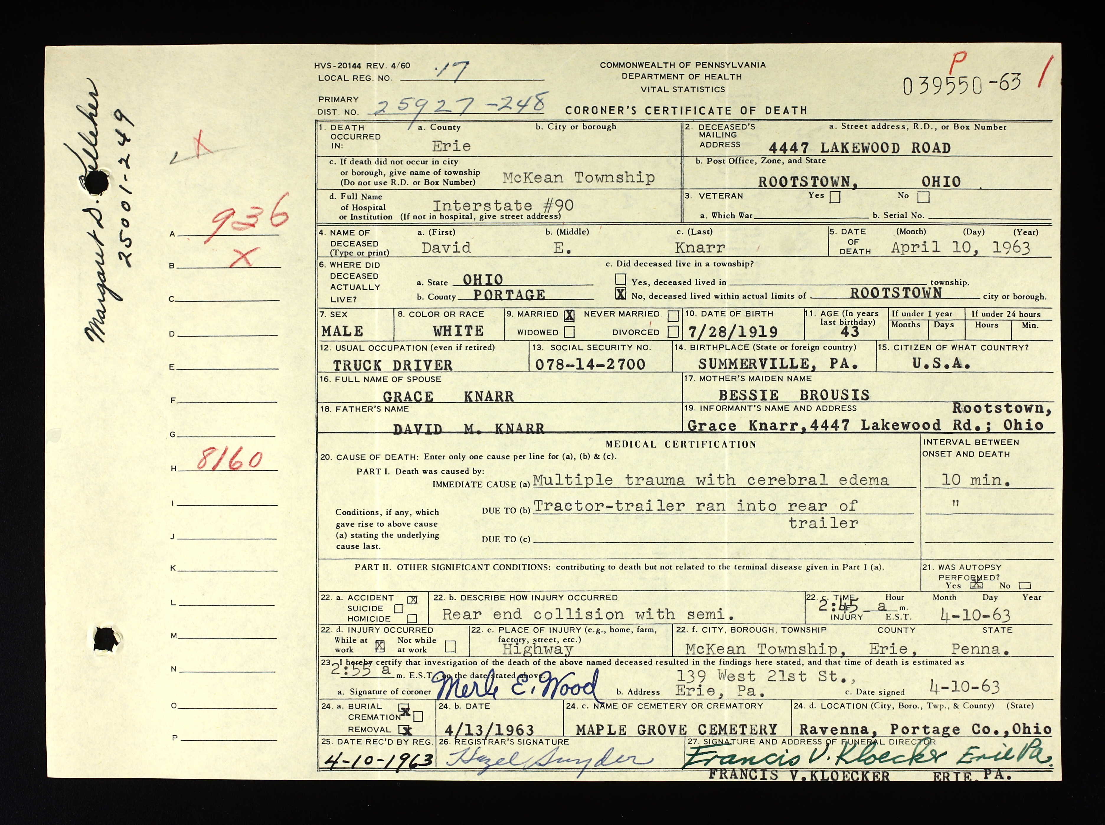 | Knarr, David E. | 28 Jul 1919 | 10 Apr 1963 | 43y 8m 12d | L | 73 | David E. Knarr | Sgt US Army, World War II | |||||