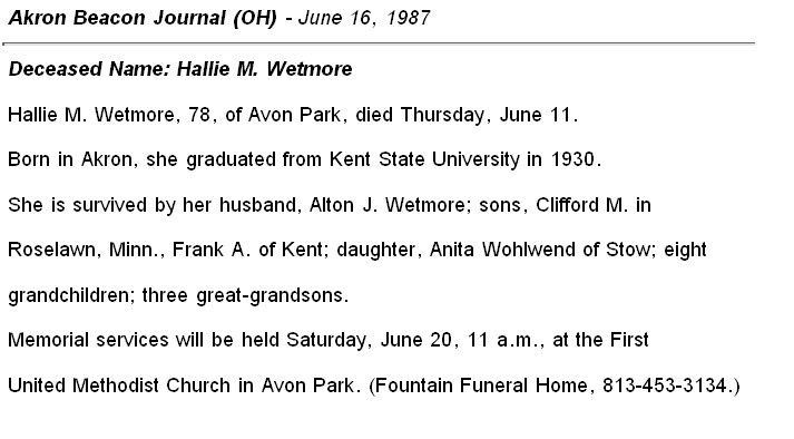| Wetmore, Hallie M. | 31 Oct 1908 | 11 Jun 1987 | 78y 7m 10d | Hallie Major | ||||||||