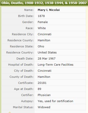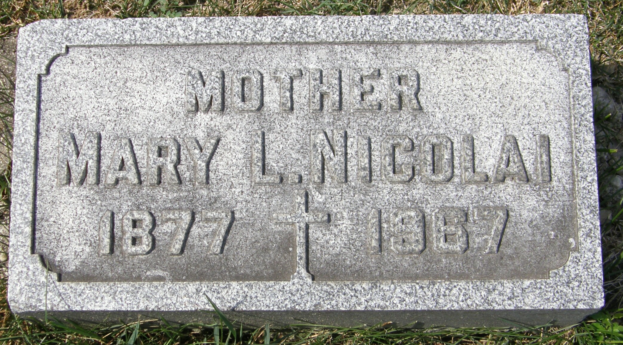 | Nicolai, Mary L. | 5 May 1877 | 28 Mar 1967 | 89y 10m 23d | Mary Louise Korthaus | ||||||||