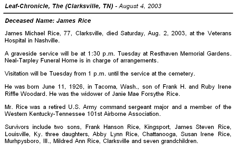 | Rice, James Michael | 11 Jun 1926 | 2 Aug 2003 | 77y 1m 22d | Garden of Valor | James Michael Rice | SGM US Army, World War II, Korea | ||||||