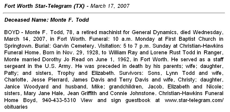 | Todd, Monte F. | 29 Nov 1928 | 14 Mar 2007 | 78y 3m 16d | Monte Francis Todd | ||||||||