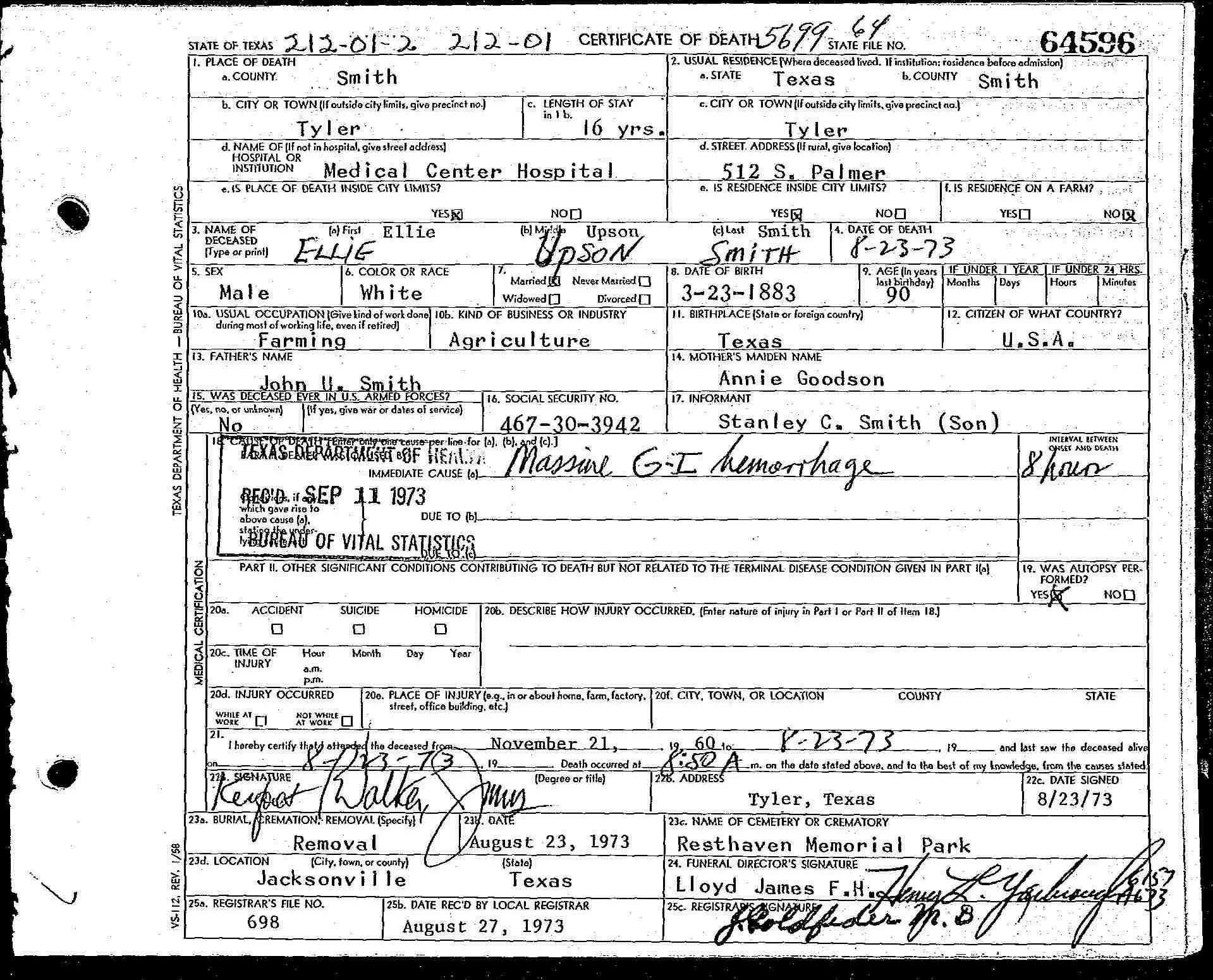 | Smith, Ellie Upson | 23 Mar 1883 | 23 Aug 1973 | 90y 5m 0d | Ellie Upson Smith | ||||||||