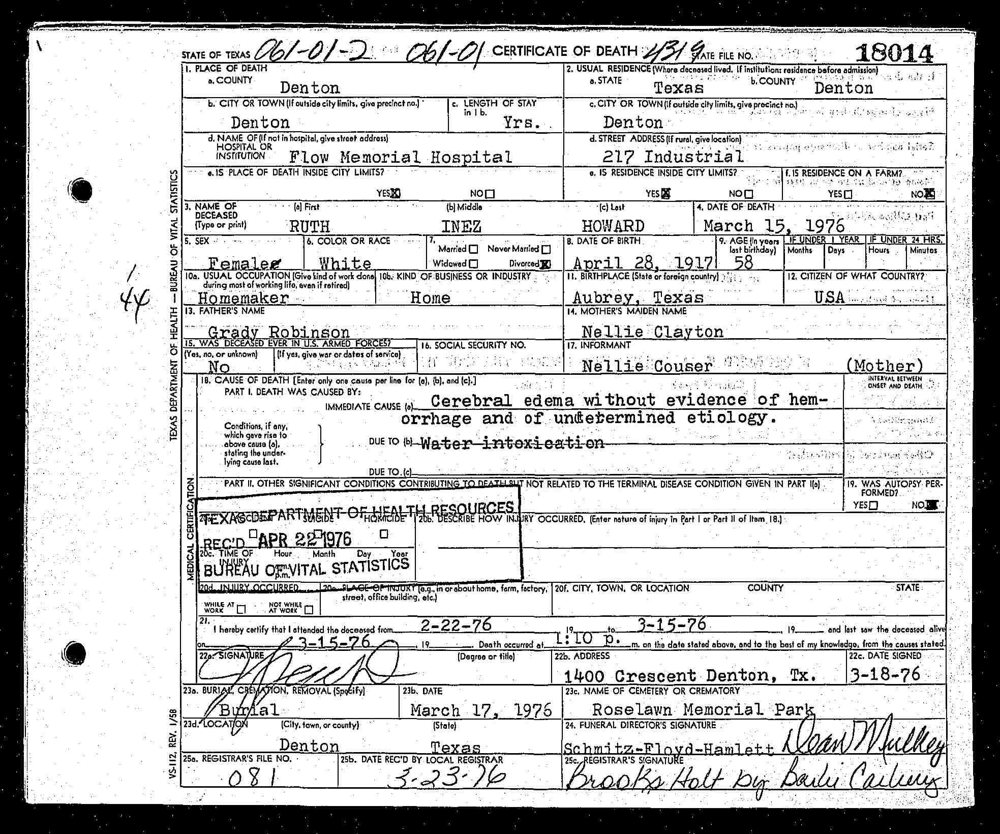 | Howard, R. Inez | 17 Apr 1916 | 15 Mar 1976 | 59y 10m 29d | Ruth Inez Robinson | ||||||||