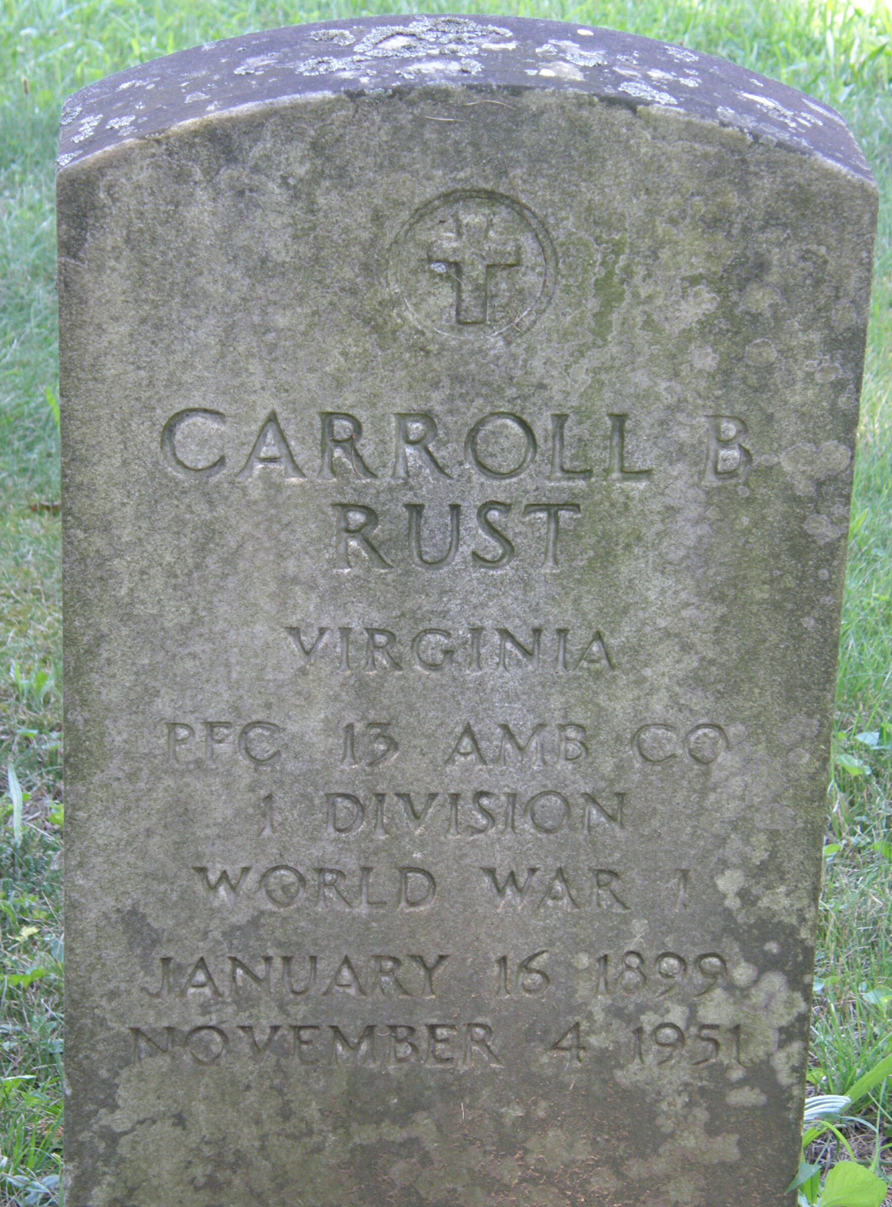 | Rust, Carroll B. | 16 Jan 1899 | 4 Nov 1951 | 52y 9m 18d | Carroll B. Rust | PFC 13 AMB CO, 1 Division, WWI | |||||||