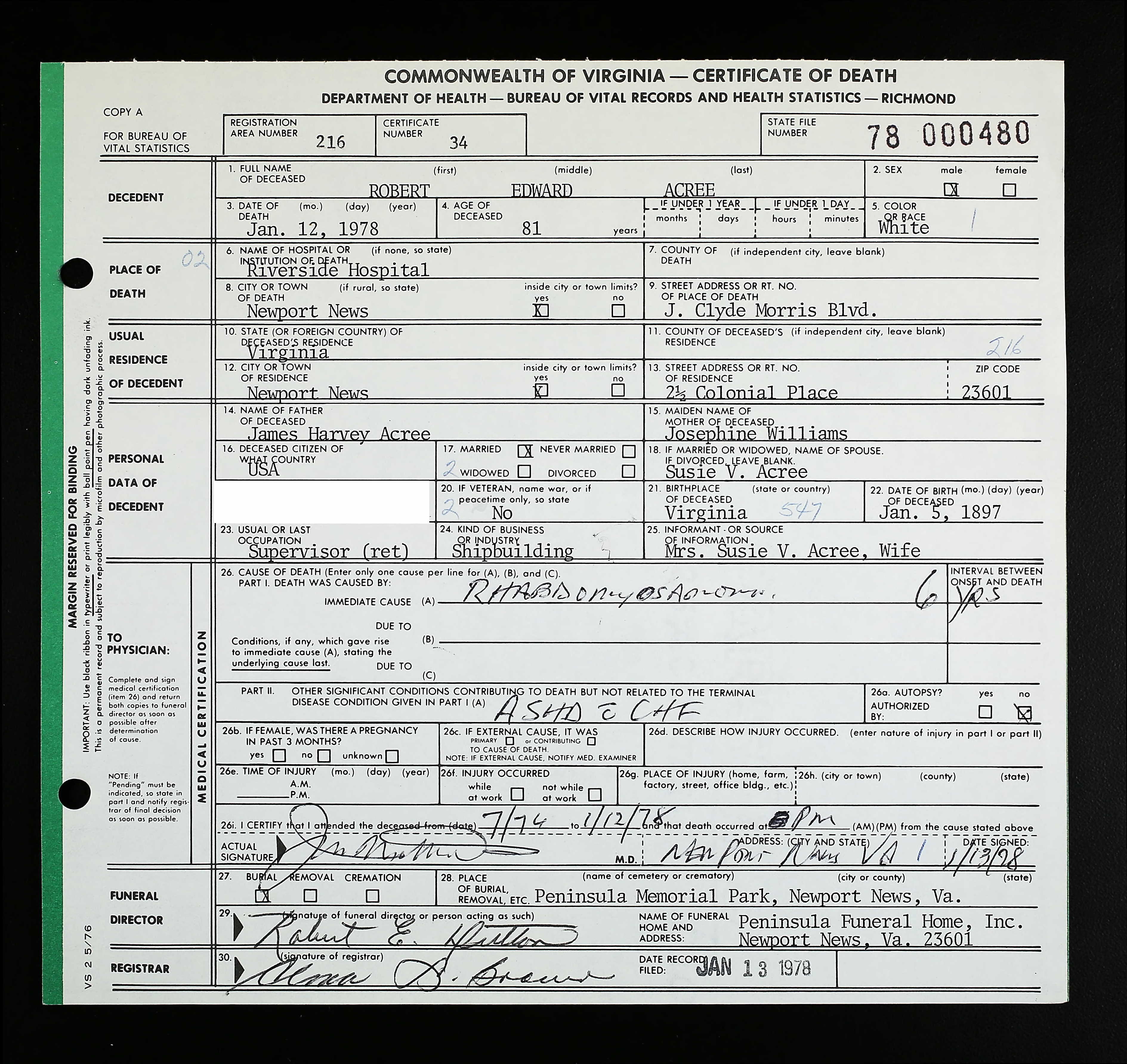 | 29 Nov 1928 | 26 Jun 2015 | 86y 6m 27d | Robert Beale Verlander | |||||||||