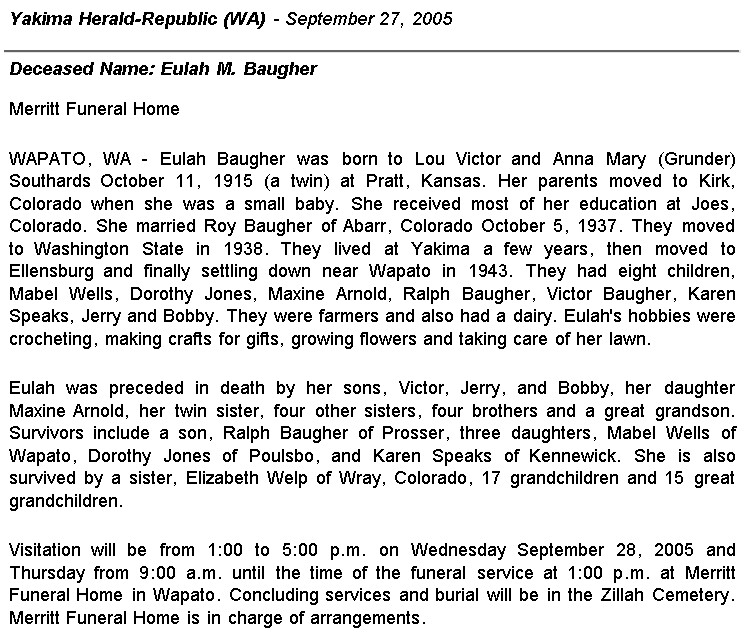 | 11 Oct 1915 | Sep 2005 | 89y 11m | Eulah Mayme Southards | |||||||||