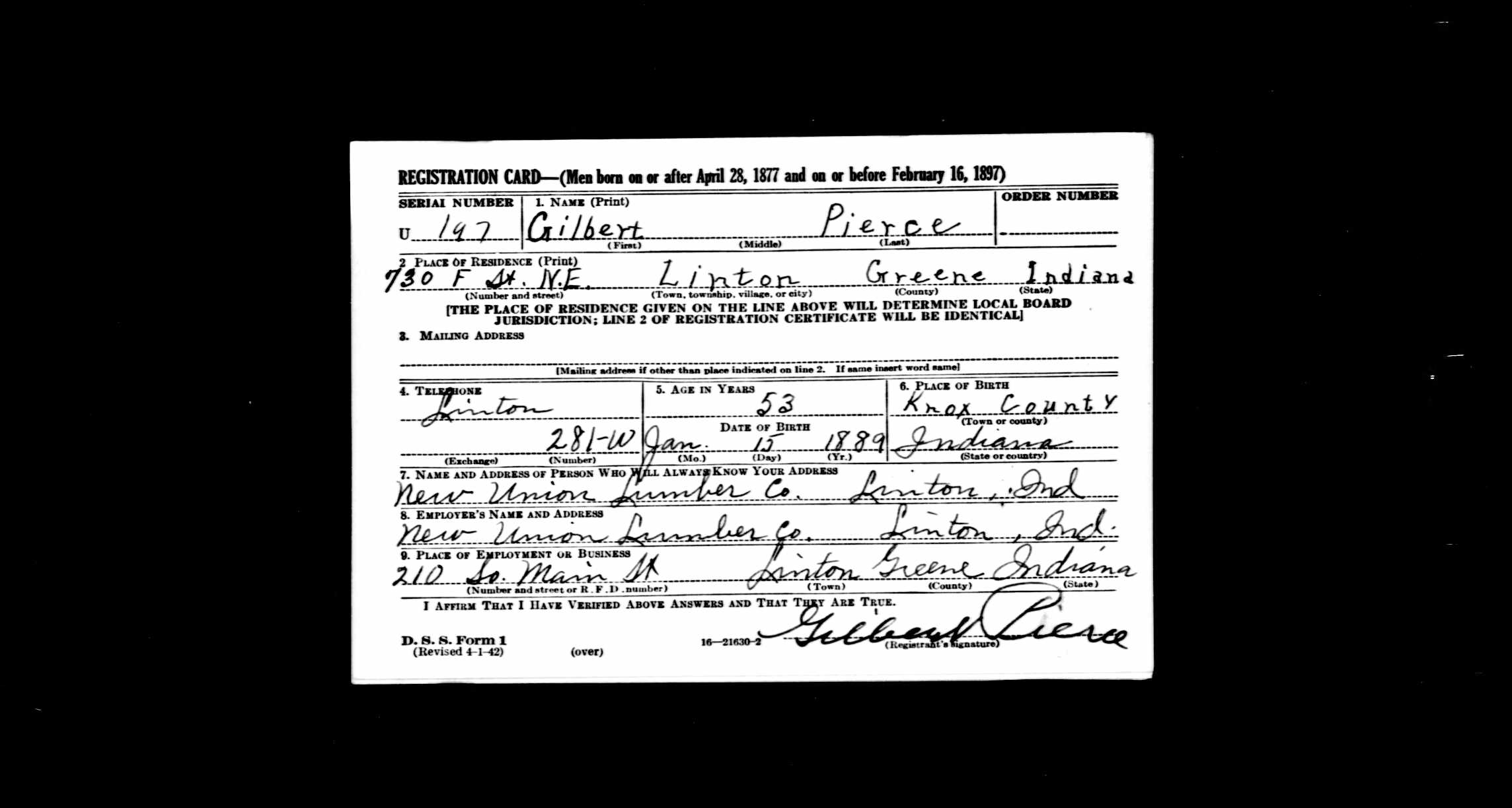 Residences1889 - Meade, Kentucky | 1900 - Garnettsville, Meade, Kentucky 1910 - Shawswick, Lawrence, Indiana 1920 - Terre Haute, Vigo, Indiana 1930 - Linton, Greene, Indiana 1977 - Linton, Greene, Indiana, USA |