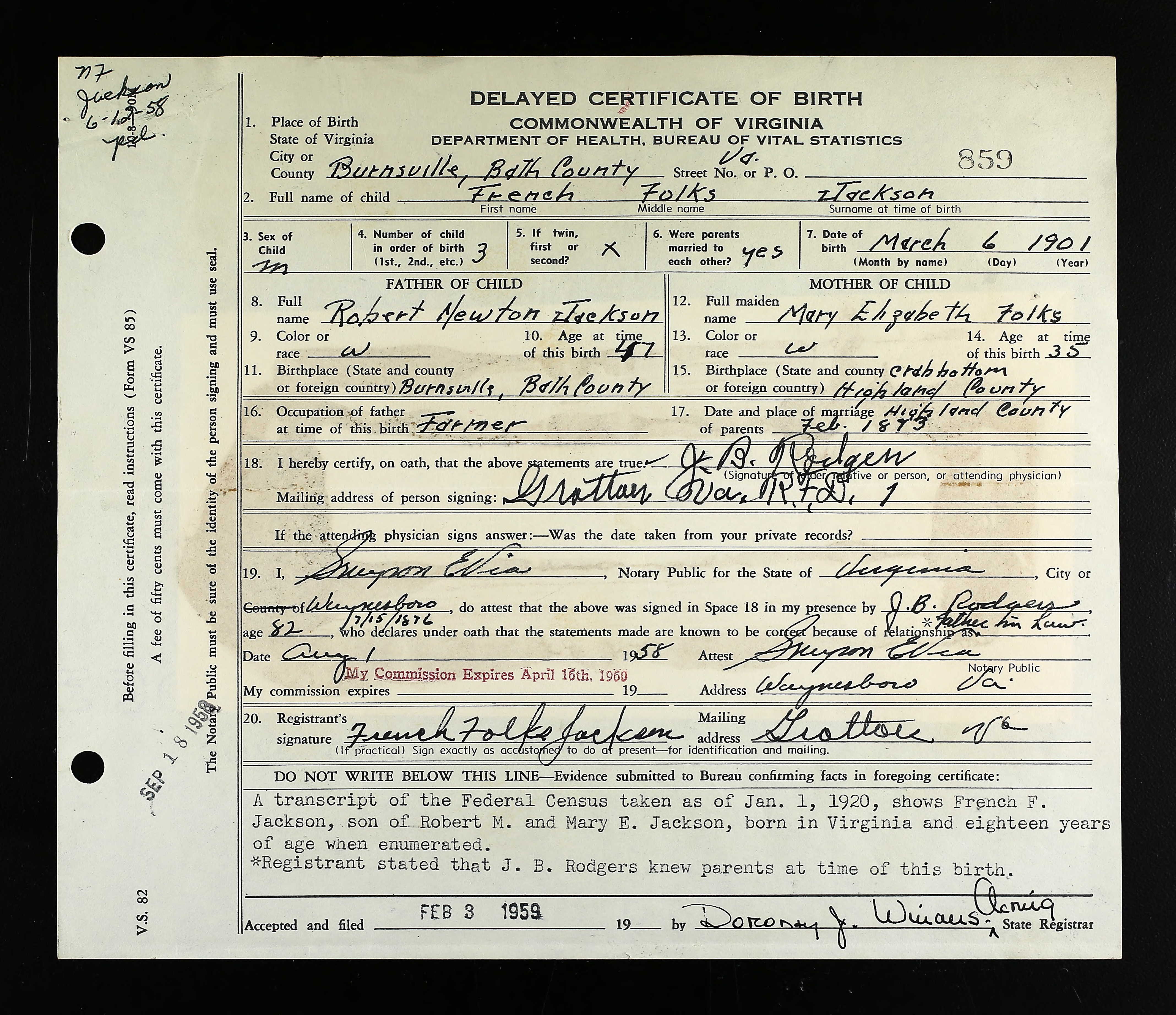 Residences1901 - Burnsville, Bath, Virginia | 1910 - Williamsville, Bath, Virginia 1920 - Williamsville, Bath, Virginia 1930 - Middle River, Augusta, Virginia 1940 - Covington, Alleghany, Virginia 1978 - , Grottoes, Rockingham, Virginia, USA |