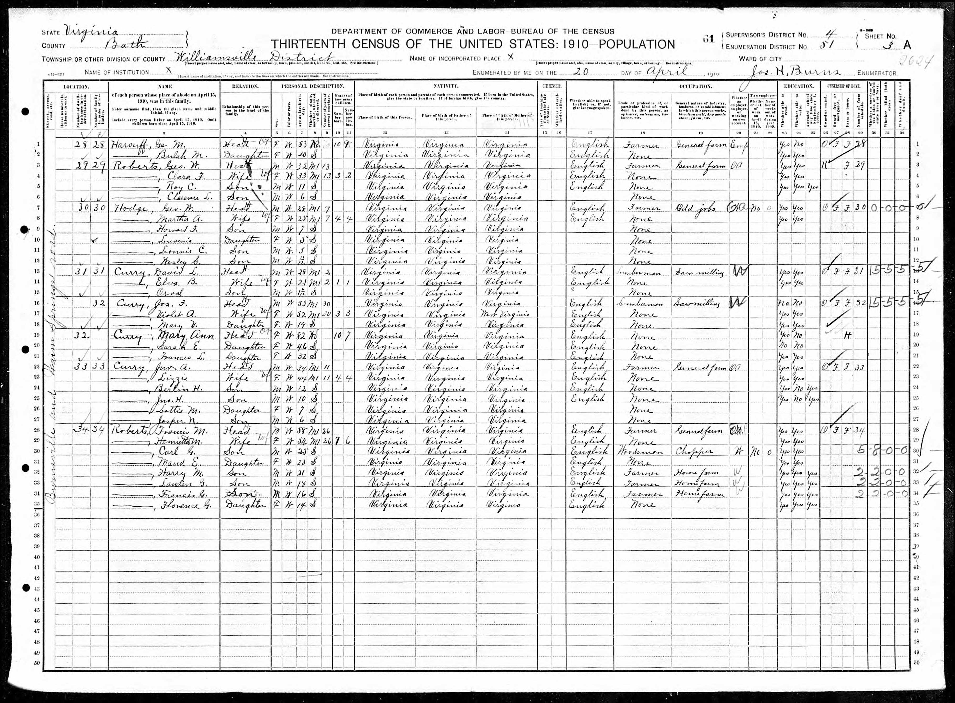Residences1882 - Burnsville, Bath, Virginia | 1900 - Williamsville, Bath, Virginia 1910 - Williamsville, Bath, Virginia 1920 - Warm Springs, Bath, Virginia 1930 - Williamsville, Bath, Virginia 1940 - Williamsville, Bath, Virginia 1971 - , Burnsville, Bath, Virginia, USA |