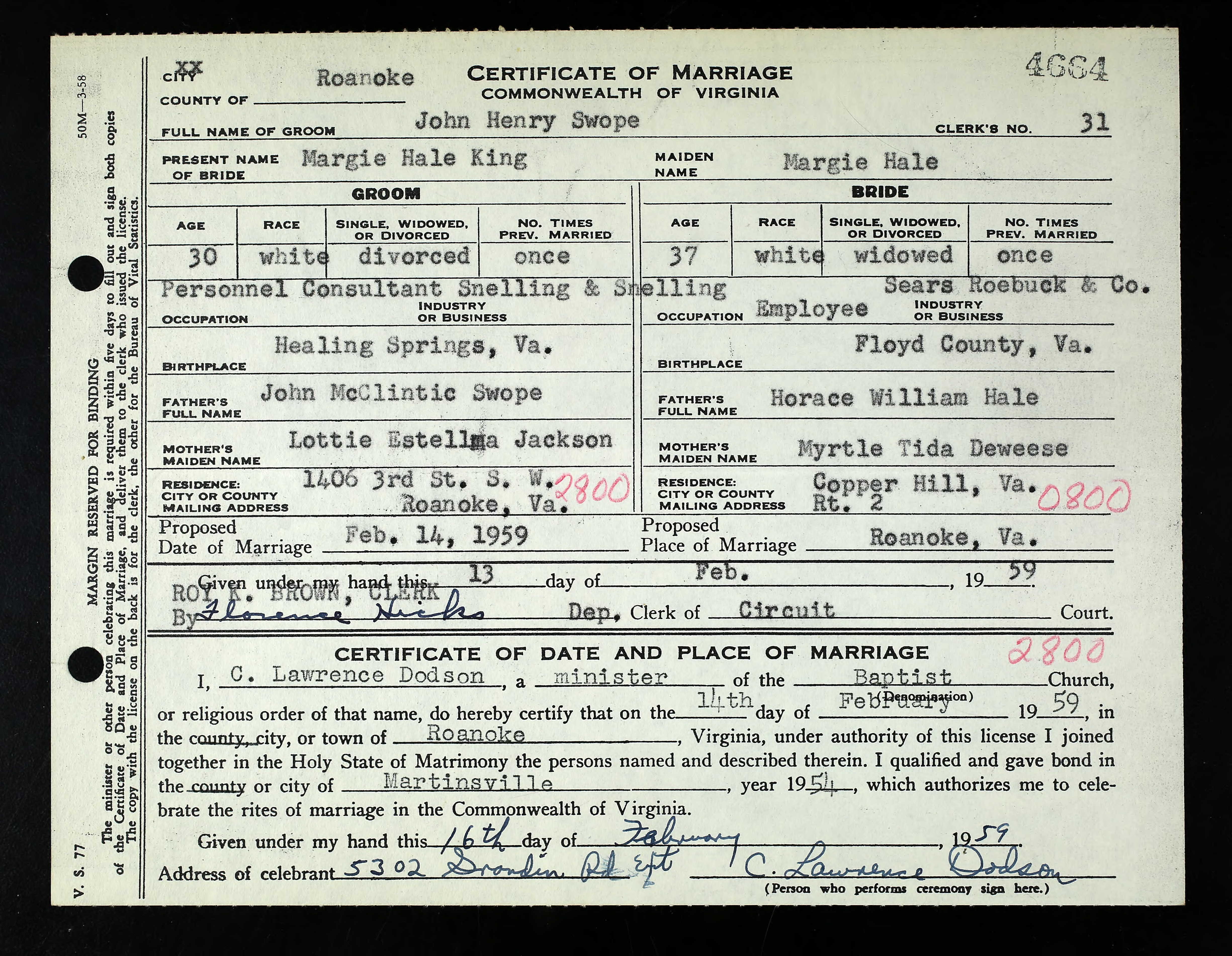 | 15 Feb 1959 - Roanoke, Roanoke City, Virginia | |