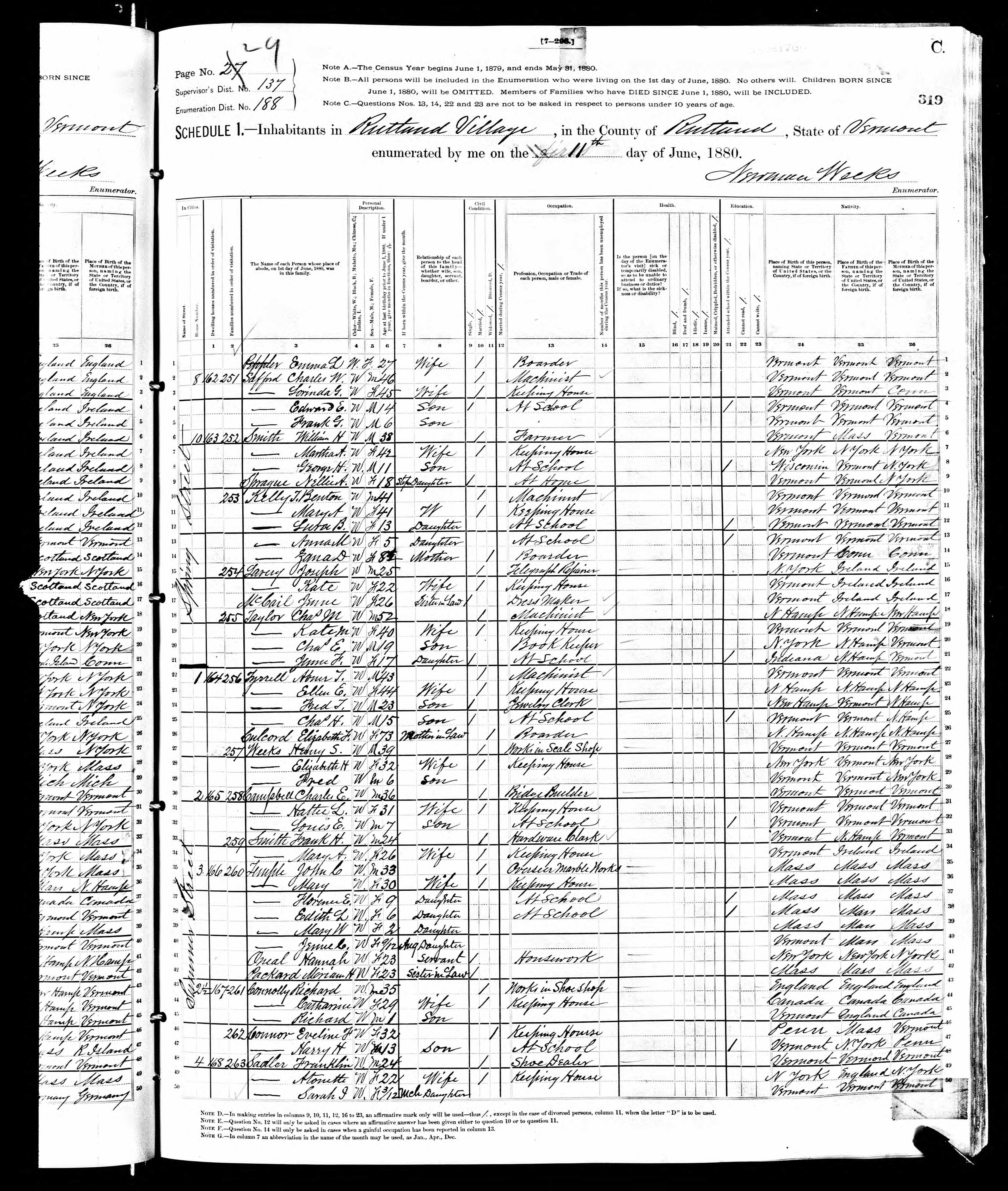 Residences1874 - Rutland, Vermont | 1880 - Rutland, Rutland, Vermont 1900 - Barre, Washington, Vermont 1910 - Pittsfield, Rutland, Vermont | 1920 - Rutland, Rutland, Vermont | 1930 - Pittsfield, Rutland, Vermont 1940 - Pittsfield, Rutland, Vermont 1966 - Rutland, Vermont |
