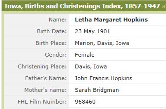 Residences1901 - Marion, Iowa | 1910 - Marion, Davis, Iowa 1920 - Marion, Davis, Iowa 1993 - Bloomfield, Davis, Iowa, USA |
