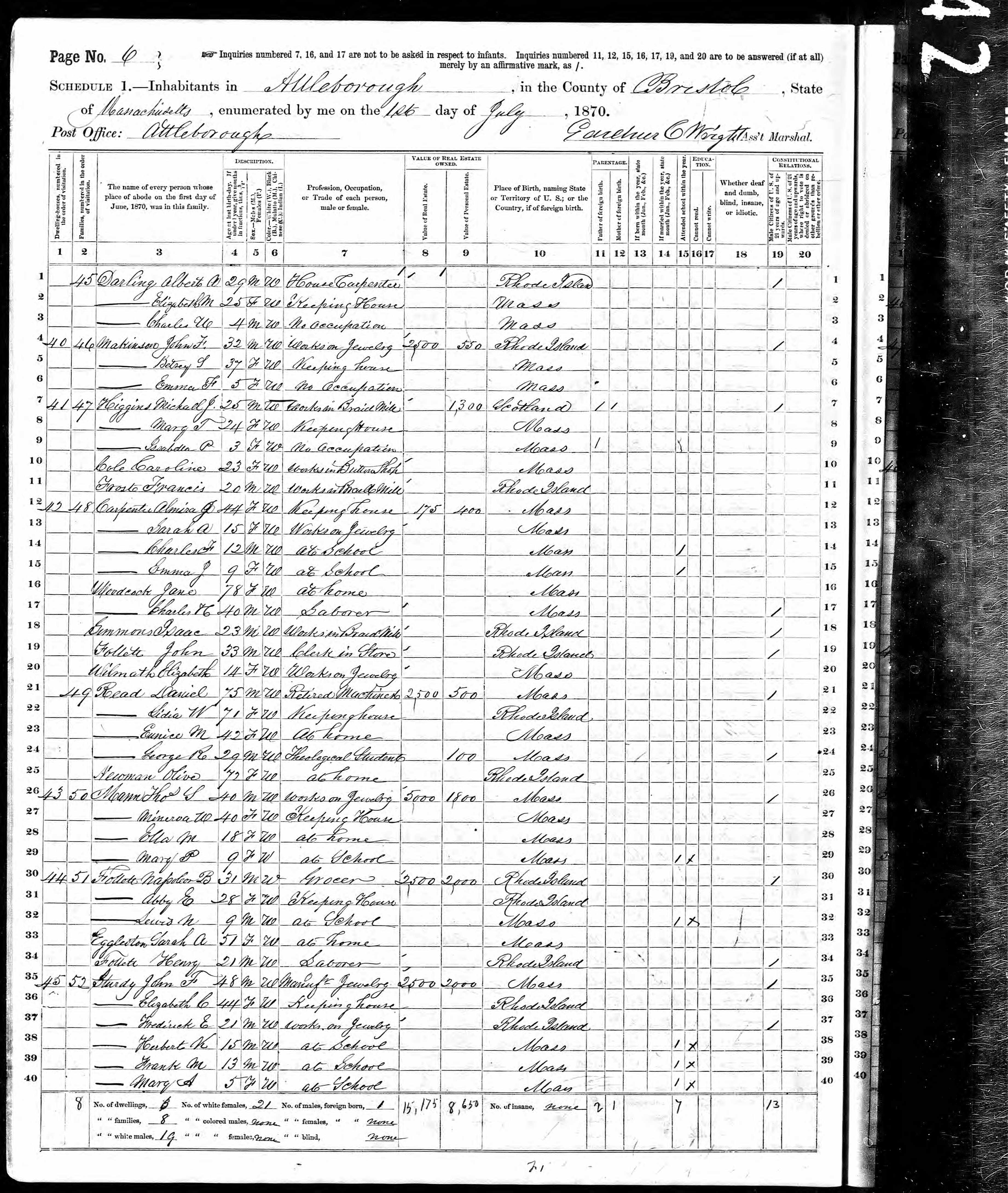 Residences1846 - Massachusetts | 1860 - Rehoboth, Bristol, Massachusetts 1870 - Attleboro, Bristol, Massachusetts 1880 - Providence, Providence, Rhode Island 1900 - Providence, Providence, Rhode Island 1910 - Providence, Providence, Rhode Island |