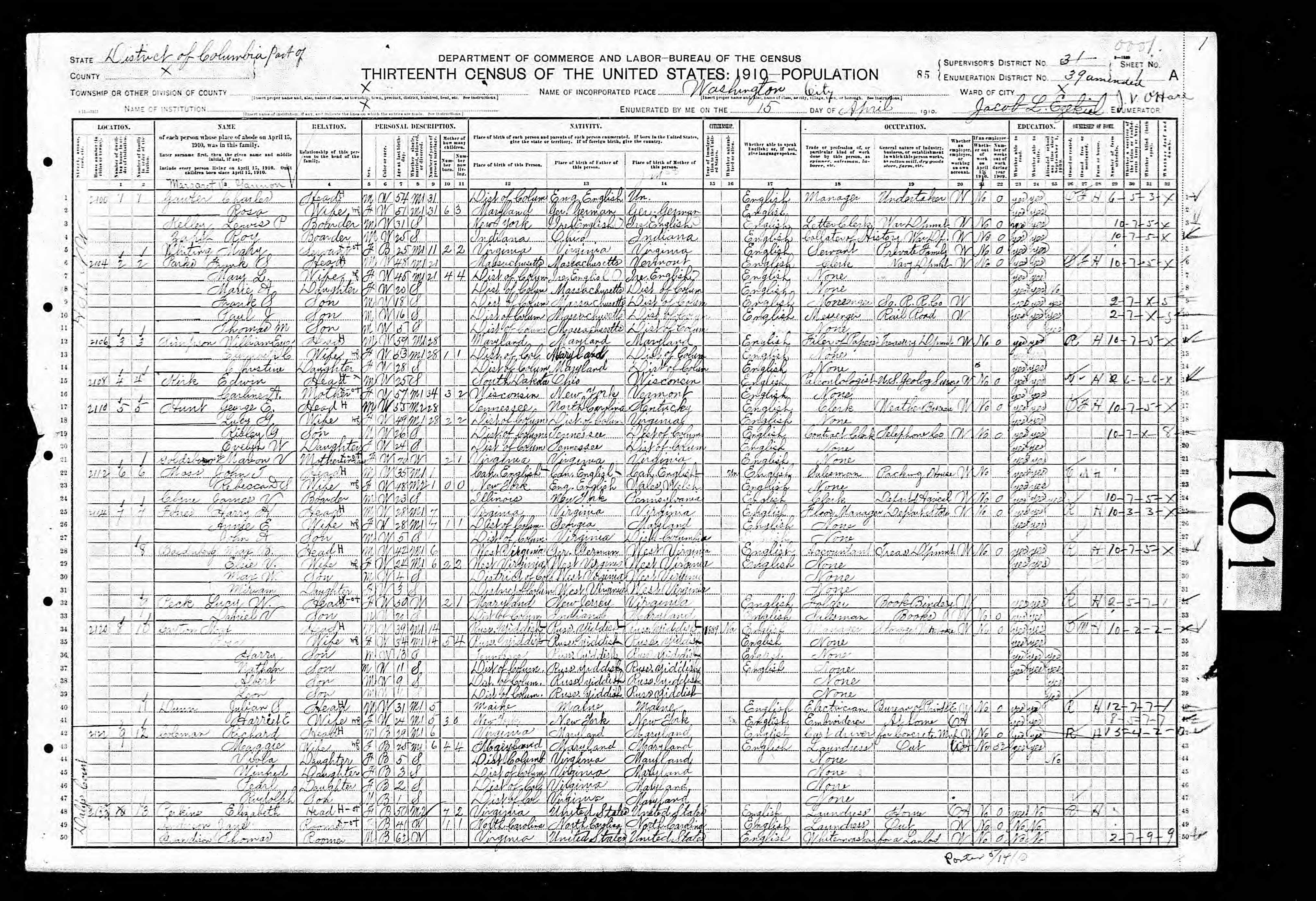 Residences1889 - Washington, District Of Columbia | 1900 - Washington, Washington, District Of Columbia 1910 - Washington, District Of Columbia 1920 - Washington, Washington, District Of Columbia 1930 - Potomac, Montgomery, Maryland 1940 - Montgomery, Maryland |