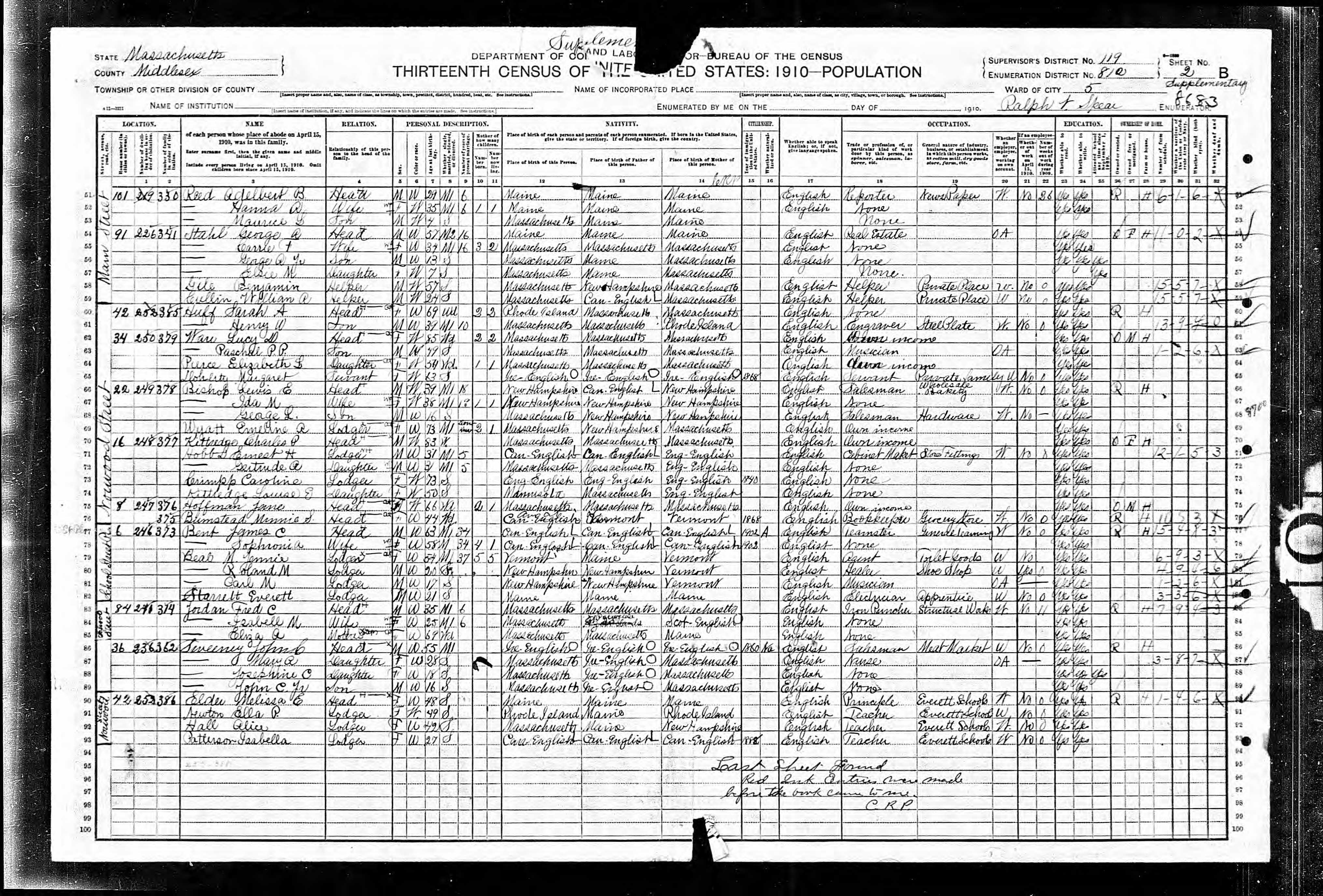 Residences1870 - Massachusetts | 1880 - Boston, Suffolk, Massachusetts 1900 - Medford, Middlesex, Massachusetts 1910 - Everett, Middlesex, Massachusetts |