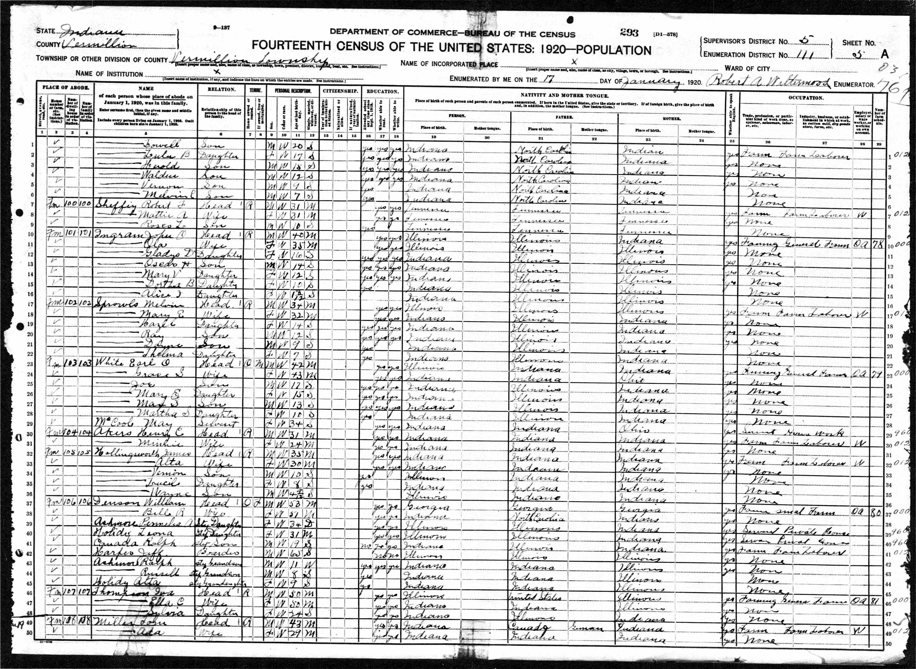 Residences1906 - Dana, Indiana | 1910 - Jackson, Hamilton, Indiana 1920 - Vermillion, Vermillion, Indiana 1972 - Indianapolis, Marion, Indiana |