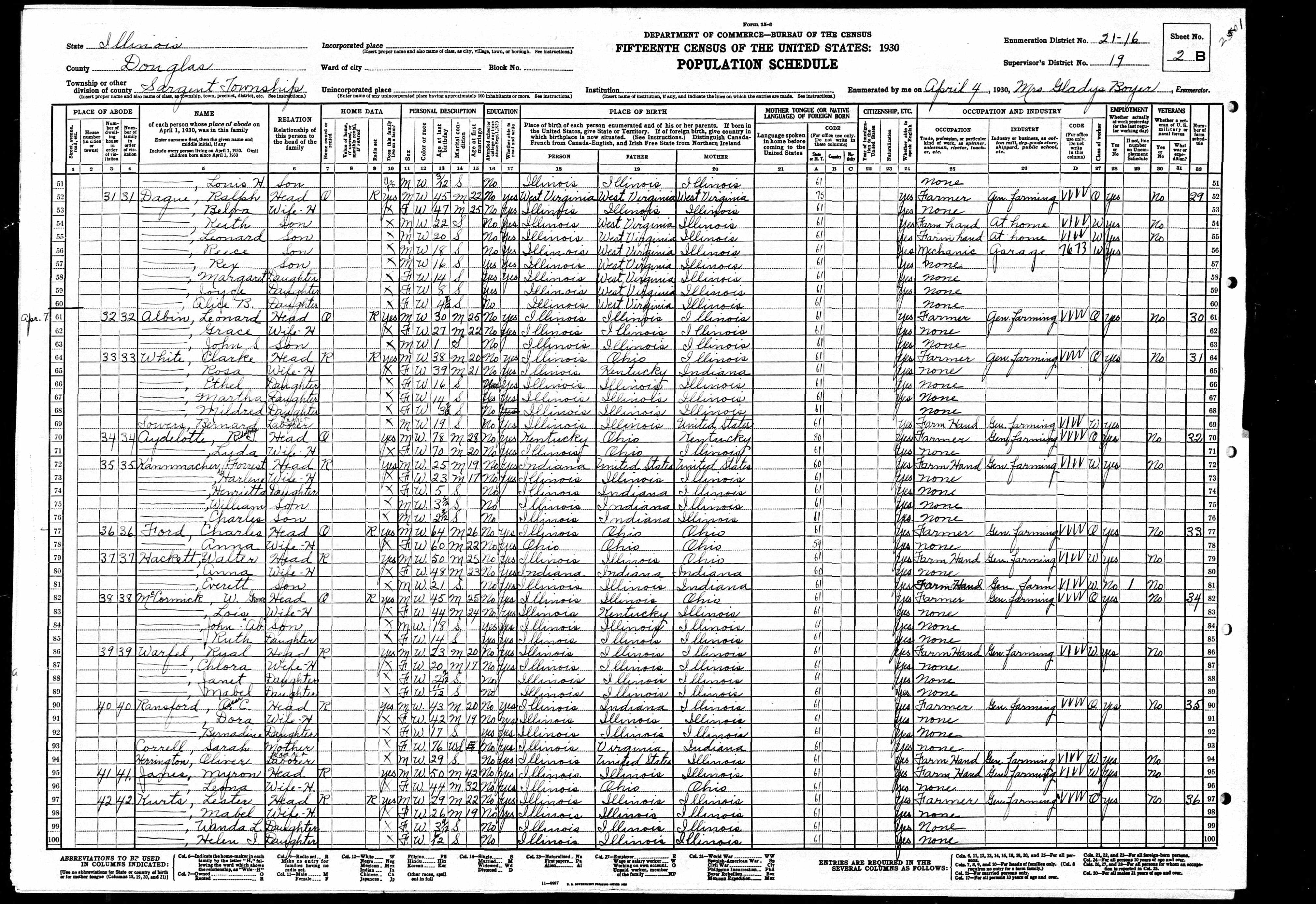 Residences1910 - Yale, Illinois | 1910 - Hunt, Jasper, Illinois 1920 - Grandville, Jasper, Illinois 1930 - Sargent, Douglas, Illinois 1935 - Olney, Illinois |